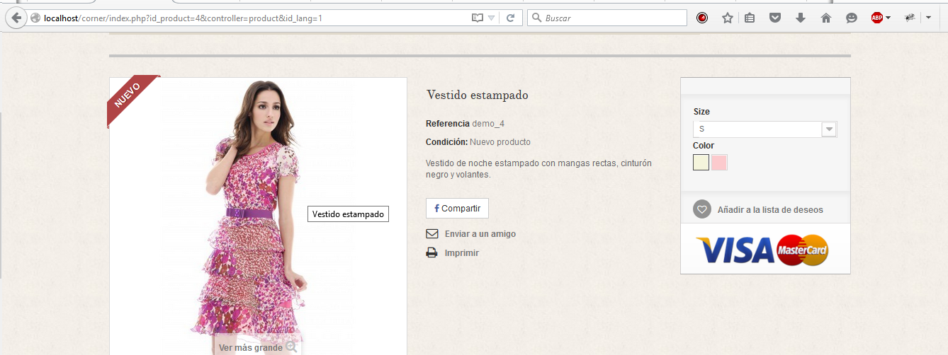 Nebur Posted October 26, 2015 Share Posted October 26, 2015 Pasos, Elimina las combinaciones para ese producto, desaparecerán las opciones de talla y color. (CATALOGO>PRODUCTOS elige editar un producto y ve a la pestaña combinaciones.) Desactiva el módulo de lista de deseos. (Bloque de Favoritos) Desactiva el módulo de logos de pago. (Bloque de logos de pago) Y con eso se quita todo el contenido "concreto", que te está apareciendo. Link to comment Share on other sites More sharing options...