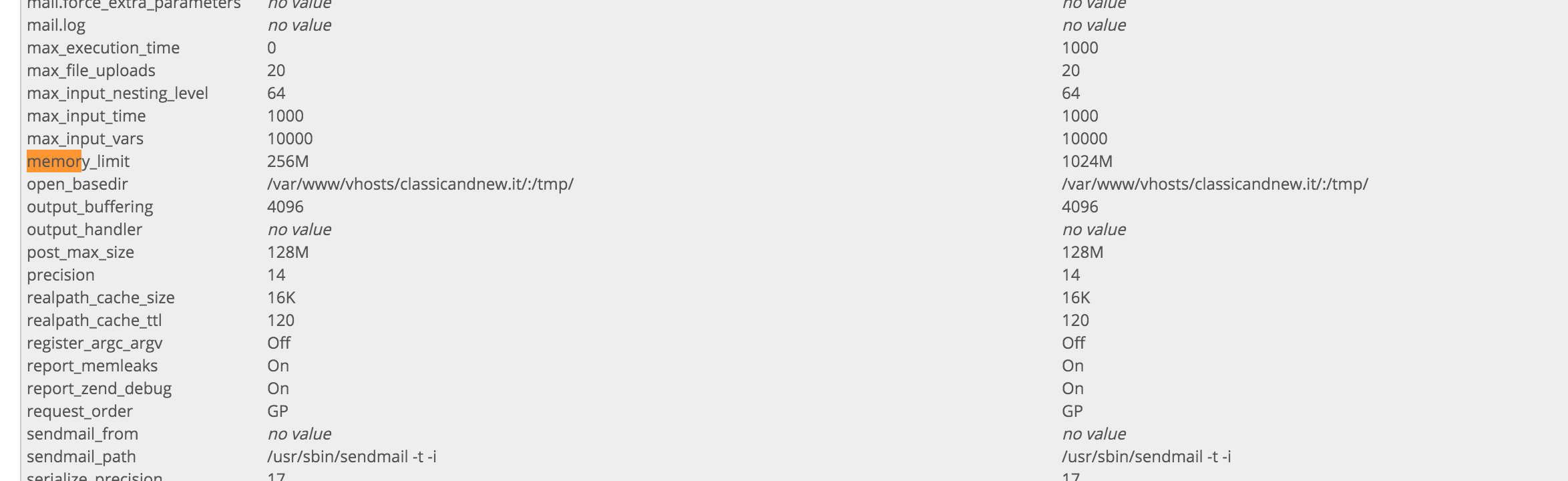 alb.rosin Posted October 29, 2015 Share Posted October 29, 2015 Hi there, i have a VPS server where i host my website www.classicandnew.it I set in Plesk panel memory_limit = 1024M but in my prestashop information page memory_limit remain 256M. I try to install the plugin by eltienda and in PHPINFO i read PHP memory_limit LOCAL is 256M and PHP memory_limit in MASTER is 1024M. Why? I try another option... i put in my directory one PHPINFO page, and in this page it result correct. http://www.classicandnew.it/phpinfo.php I think the probelm is one option / setting in prestashop, that limit memory limit to 256M. Anyone can help me? Thanks a lot Link to comment Share on other sites More sharing options...