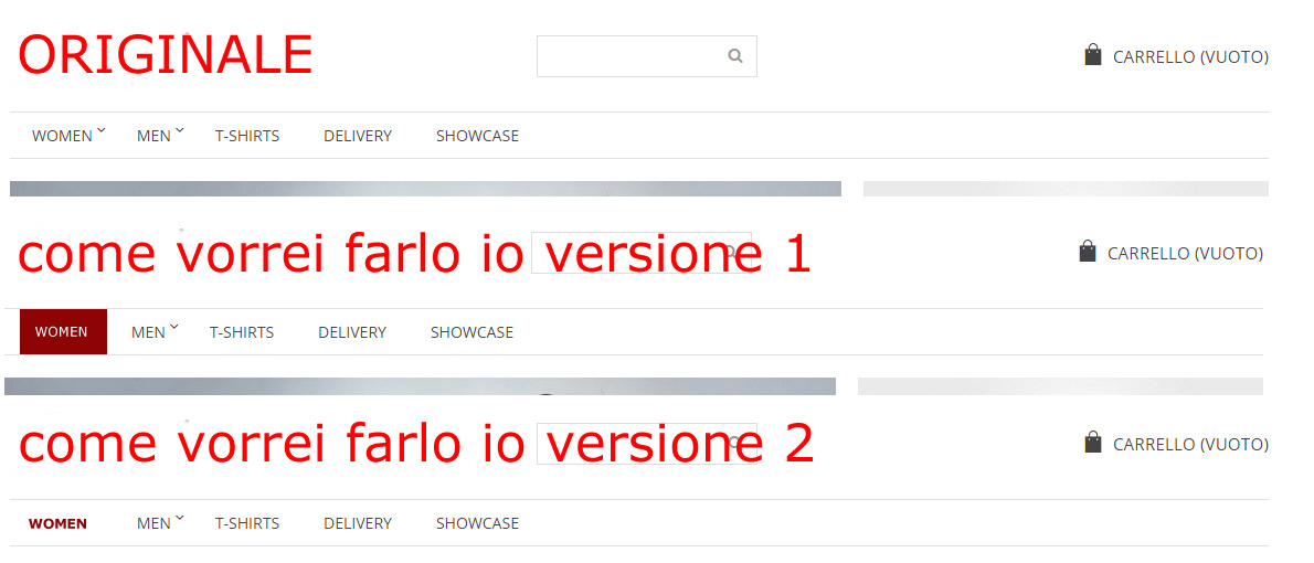 loyalone Posted November 2, 2015 Share Posted November 2, 2015 (edited) Buongiorno a tutti sto lavorando su un tema che utilizza il "Top Menù Orizzontale v2.2.2 - da PrestaShop " Il tema mi da la possibilita di modificarlo facendolo diventare megamenu o dropdown o al caso cambiare le colorazioni di tutto il menu io avrei bisogno di poter cambiare il fondo di una sola voce del menu o proprio al limite cambiare il colore del testo sempre di una sola voce, è possibile farlo??? vi allego un'immagine per far capire meglio il problema grazie mille dell'aiuto Edited November 2, 2015 by loyalone (see edit history) Link to comment Share on other sites More sharing options...