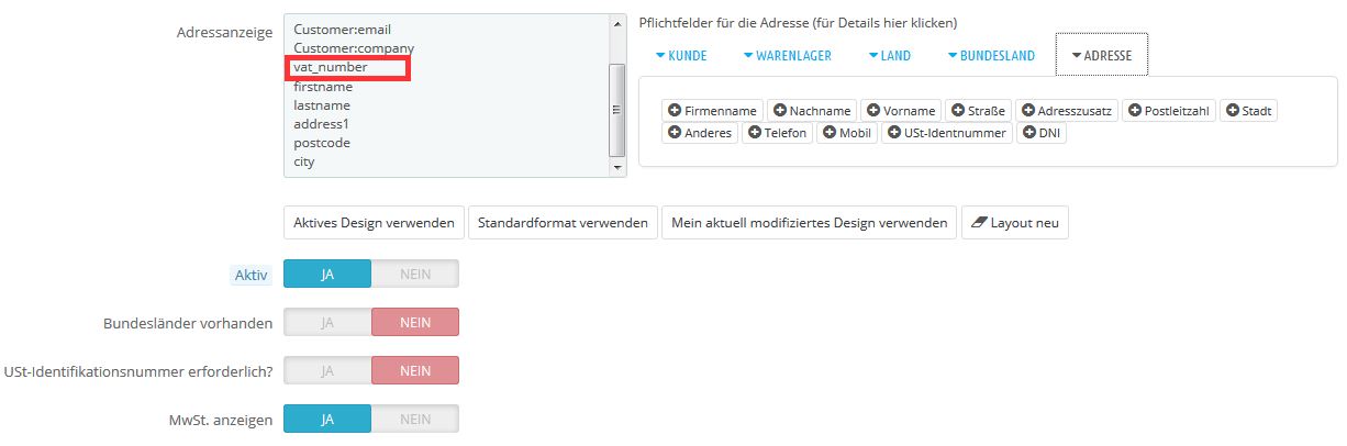 Wenn ich im Backend das Feld "USt-Identifikationsnummer erforderlich?" aktiviere, setzt der unten ein neues Feld als Steuernummer Pflichtfeld. Das benötige ich aber nicht :-(. Mir würde das USt-Identifikationsnummer als Pflichtfeld ausreichen.