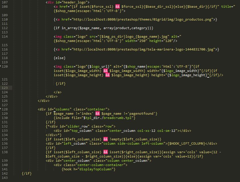 telamarinera Posted November 5, 2015 Author Share Posted November 5, 2015 Lo has entendido perfectamente y la explicacion no era demasiado completa. La url en el ejemplo que te he puesto seria la misma en todos los casos( solo esta condicionada la imagen), apuntando al dominio principal con o sin certificado ssl, al dominio principal en cualquier caso vaya ( midominio.com), es la que esta por defecto <a href="{if $force_ssl}{$base_dir_ssl}{else}{$base_dir}{/if}" title="{$shop_name|escape:'html':'UTF-8'}"> en caso de que quieras condicional tambien para cada logo puedes añadirla la url directamente entre la comillas <a href="http://www.midominio.com/subdominio"> Y se tiene que incluir todo el enlace, url e imagen en el condicional Buenas de nuevo, Añadí el código tal que así: <div id="header_logo"> <a href="{if isset($force_ssl) && $force_ssl}{$base_dir_ssl}{else}{$base_dir}{/if}" title="{$shop_name|escape:'html':'UTF-8'}"> {<a href="http://localhost:8080/prestashop/themes/01grid/img/logo_productos.png">} {if in_array($page_name, array(product,category))} <img class="logo" src="{$img_ps_dir}logo_{$page_name}.jpg" alt="{$shop_name|escape:'html':'UTF-8'}" width="250" height="120"/> {<a href="http://localhost:8080/prestashop/img/tela-marinera-logo-1444831700.jpg">} {else} <img class="logo"{$logo_url}" alt="{$shop_name|escape:'html':'UTF-8'}"{if isset($logo_image_width) && $logo_image_width} width="{$logo_image_width}"{/if}{if isset($logo_image_height) && $logo_image_height} height="{$logo_image_height}"{/if}/> {/if} </a> </div> No funciona pero creo saber una parte, que es que alguna llave no está cerrada, por los colores que lanza el sublime text. No sé si habrá algo más mal puesto por mi parte, que no me extrañaría. Gracias de antebrazo Ventura Link to comment Share on other sites More sharing options...