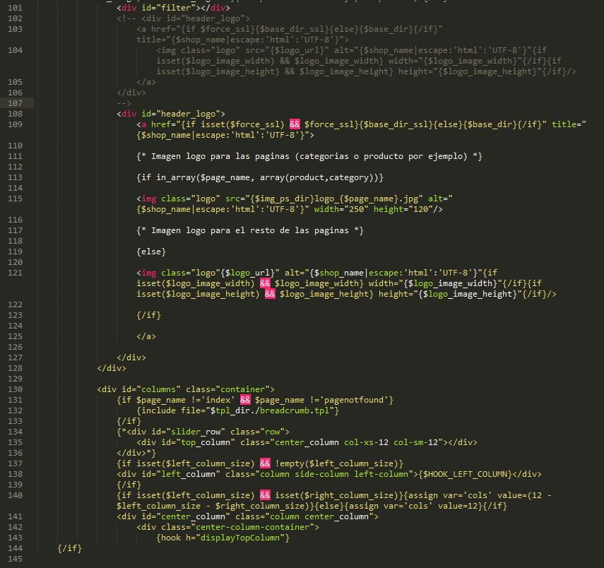 ventura Posted November 6, 2015 Share Posted November 6, 2015 Tiene pinta de que te has cargado el enlace del logo default, posiblemente por algún cierre de un condicional. Pero con paciencia se consigue todo. Sustituye esto <div class="container"> <div class="row"> <div id="header_logo"> <a href="{if isset($force_ssl) && $force_ssl}{$base_dir_ssl}{else}{$base_dir}{/if}" title="{$shop_name|escape:'html':'UTF-8'}"> <img class="logo img-responsive" src="{$logo_url}" alt="{$shop_name|escape:'html':'UTF-8'}"{if isset($logo_image_width) && $logo_image_width} width="{$logo_image_width}"{/if}{if isset($logo_image_height) && $logo_image_height} height="{$logo_image_height}"{/if}/></a></div> Por esto <div class="row"> <div id="header_logo"> <a href="{if isset($force_ssl) && $force_ssl}{$base_dir_ssl}{else}{$base_dir}{/if}" title="{$shop_name|escape:'html':'UTF-8'}"> {if in_array($page_name, array(product,category))} <img class="logo img-responsive" src="{$img_ps_dir}logo_{$page_name}.png" alt="{$shop_name|escape:'html':'UTF-8'}" width="200" height="200"/> {else} <img class="logo img-responsive" src="{$logo_url}" alt="{$shop_name|escape:'html':'UTF-8'}"{if isset($logo_image_width) && $logo_image_width} width="{$logo_image_width}"{/if}{if isset($logo_image_height) && $logo_image_height} height="{$logo_image_height}"{/if}/> {/if} </a> </div> Sube los archivos logo por ejemplo en formato .png nombrados de esta manera a la ruta /img logo_product.png logo_category.png y ya estara 1 Link to comment Share on other sites More sharing options...