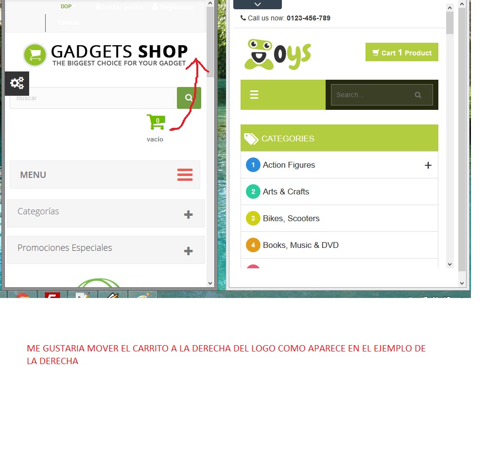 chucurulo Posted November 6, 2015 Share Posted November 6, 2015 hola amigos, uso el tema por defecto de PS 1.6, he modificado la parte del ccs un poco para lograr que solo se muestre el carrito, sin ningun texto, en la version de escritorio me queda perfecto, ahora bien me interesa que en la version resposive para dispositivos moviles el carrito se coloque al lado del logo de la tienda a la derecha. le agrego una imagen de como lo tengo actualmente y como deseo que quede. la parte izquierda es mi pagina, la parte derecha es un modelo que quisiera que quedara asi. agradezco su ayuda de ante manos. Link to comment Share on other sites More sharing options...