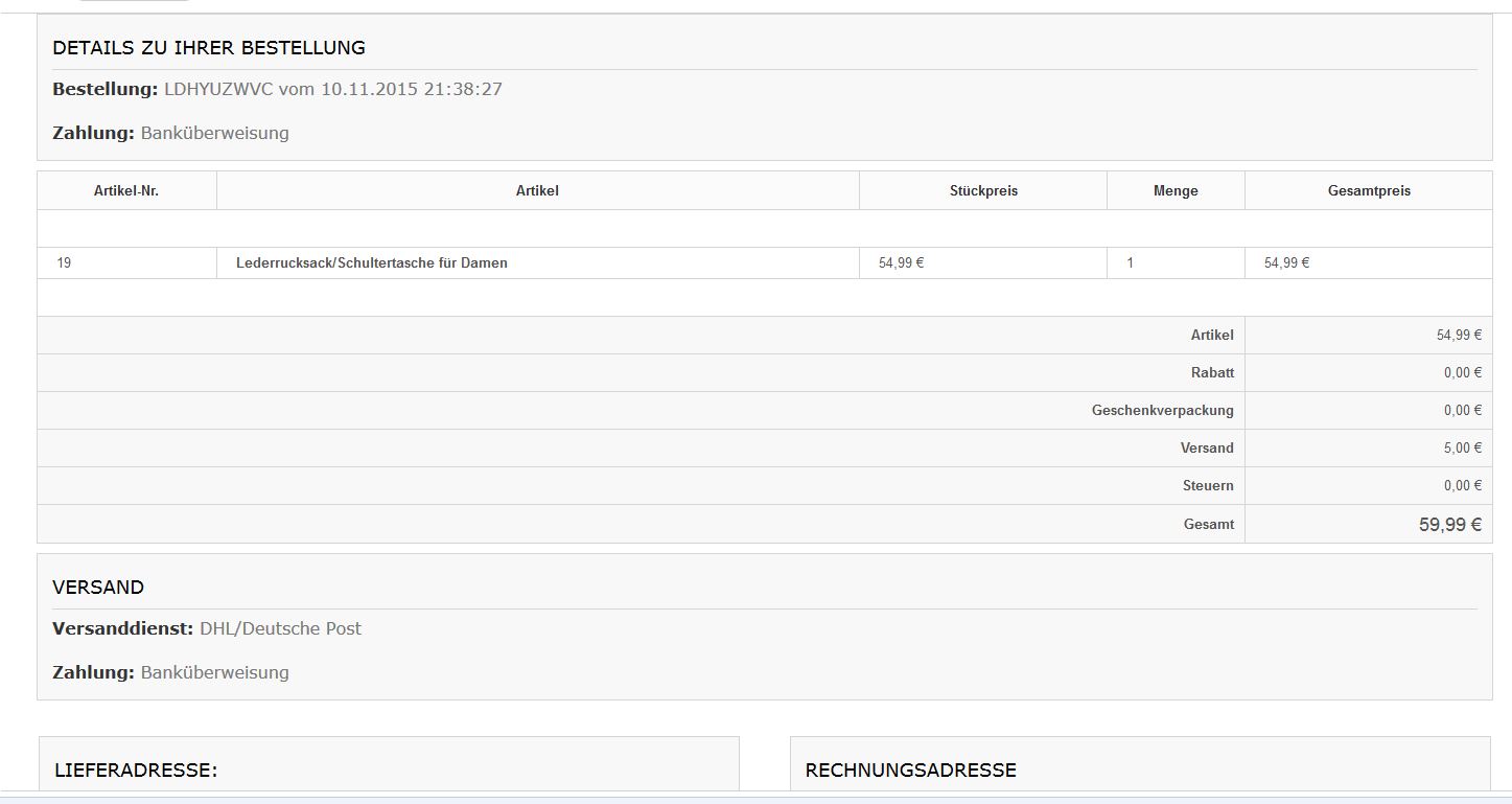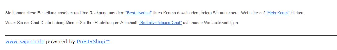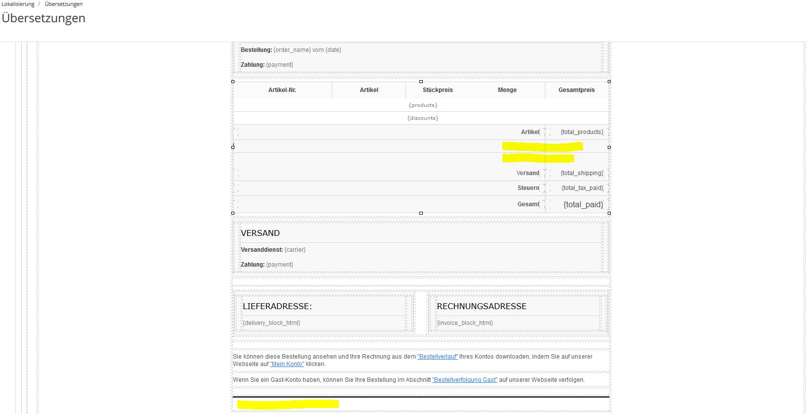 Vitali% Posted November 10, 2015 Share Posted November 10, 2015 Hallo Leute, ich arbeite zur Zeit an einem Shop, bin auch schon ziehmlich weit gekommen. Doch jetzt habe ich folgendes Problem:Ich habe in Übersetzungen->E-Mail-Vorlagen->vordefinierte Mails->order_conf die Zeilen Rabatt, Geschenkverpackung und die Fussnote powered by Prestashop gelöscht (in der HTML-Version). Leider hat sich aber die Email, die der Kunde bekommt nicht verändert. Ich meine der Inhalt der Bestätigung der Bestellung. Kennt jemand von auch das Problem bzw. kann mir jemand weiterhelfen? Vielen Dank für eure Antworten Link to comment Share on other sites More sharing options...
