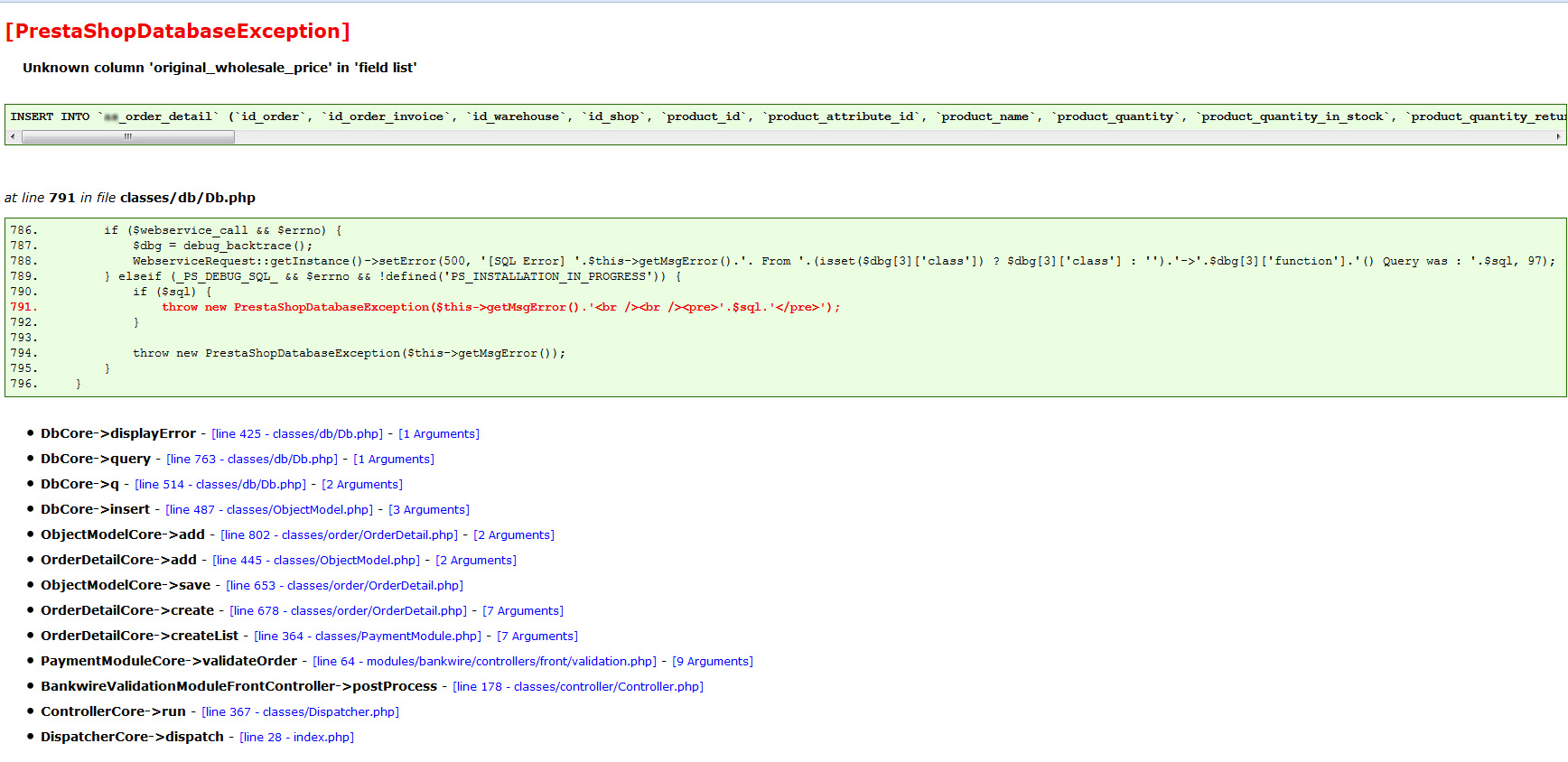 goctan Posted November 14, 2015 Author Share Posted November 14, 2015 (edited) Ok sorry. I start from the beginning. I had a shop on Prestashop 1.4, that I upgraded to 1.6 with the 1-click-upgrade module (juste to have the good number of columns in the tables of the database) Then I exported all the tables (of the upgraded Prestashop) relevant to the orders and customers with this PHP code : <?php system("mysqldump --host=databasename.mysql.db --user=xxxxxxxxxxxx --password=xxxxxxxxxxxx --default-character-set=utf8 --no-create-db --opt --tables databasename ps_access ps_address ps_cart ps_cart_product ps_cmcic_reference ps_customer ps_customer_group ps_orders ps_order_carrier ps_order_detail ps_order_detail_tax ps_order_history ps_order_invoice ps_order_invoice_payment ps_order_payment -r databasename.sql"); ?> and after installing a clean version of Prestashop 1.6.1.1, I imported the .sql in phpmyadmin. No errors. But now I have tryed to buy with the bankwire module (to test), I have this error (attached file): [PrestaShopDatabaseException] Unknown column 'original_wholesale_price' in 'field list' So now I'm pretty sure that the problem comes from my database, I think Prestashop can't write in the table order_details ... Edited November 14, 2015 by goctan (see edit history) 1 Link to comment Share on other sites More sharing options...