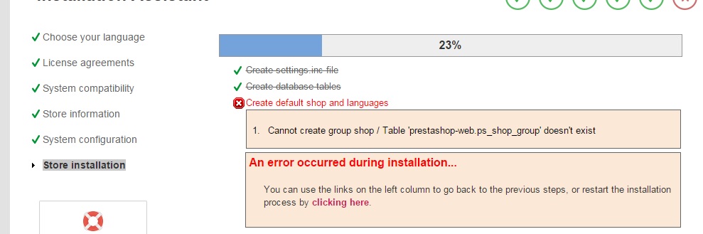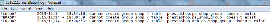 kdesigns702 Posted November 15, 2015 Share Posted November 15, 2015 (edited) Hello everyone I'm having a problem with installing PrestaShop 1.6.1.2 onto my localhost (WAMPP). Everything works fine until It gets to the store Installation part. The error it reads Create default shop and languages* Cannot create group shop / Table 'prestashop-web.ps_shop_group' doesn't exist Screenshot - http://img.photobucket.com/albums/v641/BeantownPlaya101/error_zpskmm2xwtm.jpg I believe this is the error log. here - http://img.photobucket.com/albums/v641/BeantownPlaya101/errorlog2_zpskzdrfsjz.png I'm running windows 8. I don't know what's wrong, I've spent the last day and a half trying to install PrestaShop on my computer. Any help would be greatly appreciated. Edited November 19, 2015 by kdesigns702 (see edit history) Link to comment Share on other sites More sharing options...