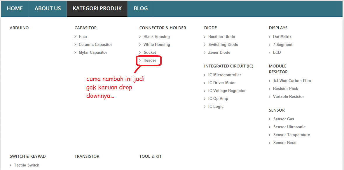 midayo Posted November 16, 2015 Author Share Posted November 16, 2015 tapi masta ada gak cara lain seperti cara diatas... soalnya urutannya sesuai abjad... kalo saya tambah lagi 1 sub categories misal di connector & holder, jadi gak karuan drop downnya... kalau di column gitu kan sepertinya jadi teratur nantinya... Link to comment Share on other sites More sharing options...