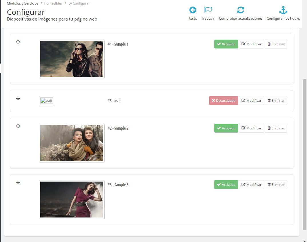 Wintermute Posted November 16, 2015 Share Posted November 16, 2015 (edited) Hola a todos, He intentado modificar las fotos que aparecen en el tema por defecto de prestashop 1.6.1.2 para subir las mías pero no hay manera. No puedo editar las que están ni añadir otras nuevas. Cuando lo hago, la foto no aparece ni en el backoffice ni, obviamente en el front. Aparece el icono de enlace roto (foto adjunta). Cosas que he probado: - Desinstalar el módulo y volverlo a instalar. - Desintalar el módulo y eliminar las carpetas del ftp en modules/homeslider y themes/modules/homeslider. - Volver a instalar. - Limpiar caché. - Poner Java al final. No sé qué más hacer. ¿Alguien podría ayudarme? Muchas gracias. [Edit] Edito para decir que tampoco puedo sustituir o modificar las fotos de los "ganchos" en la plantilla por defecto. En este caso, me sale el siguiente error: Se ha producido un error mientras se subía la imagen. Edited December 2, 2015 by Wintermute (see edit history) Link to comment Share on other sites More sharing options...