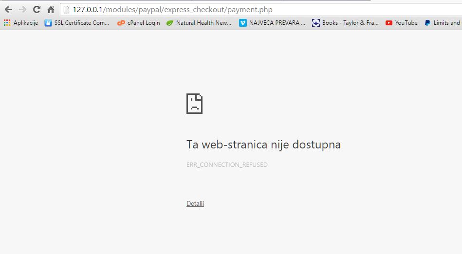 Sibenik-CRO Posted November 17, 2015 Share Posted November 17, 2015 Hi , i am using paypal module and prestashop 1.6+ version. When i add some items to cart and try to click that "paypal checkout" icon, browser redirects me to http://127.0.0.1/modules/paypal/express_checkout/payment.php. Can you please help me , thank you my page is: http://www.sanjak-webshop.com/ Link to comment Share on other sites More sharing options...