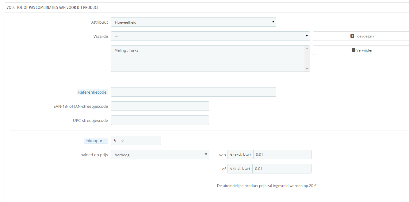 Zonder attributen wordt de prijs goed weergeven, zodra ik attributen ga toevoegen (In dit geval 'Turks') dan wordt de prijs veranderd naar 0,00 euro.