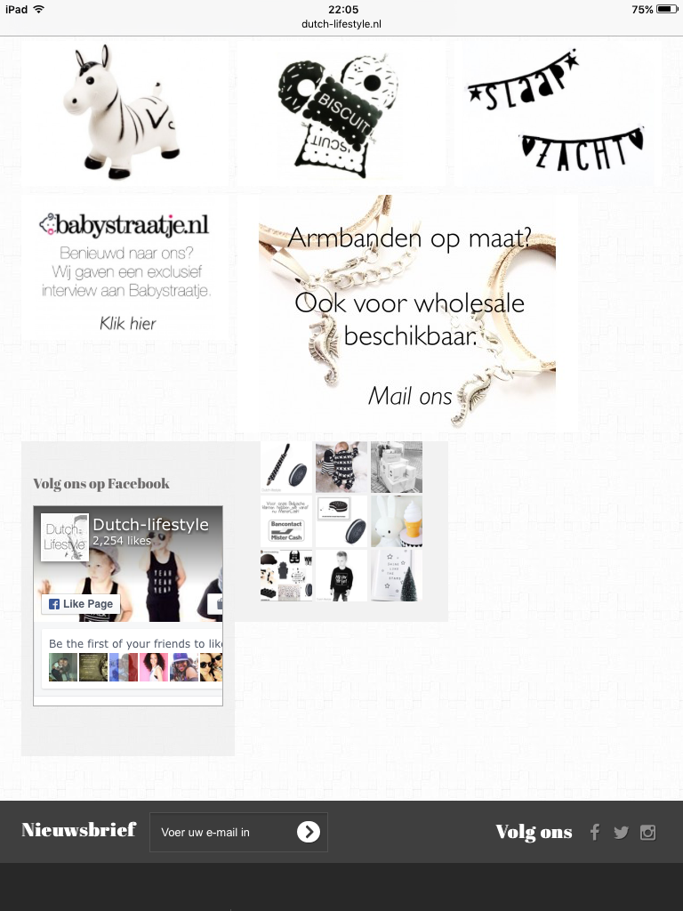 Dutch-lifestyle Posted November 17, 2015 Share Posted November 17, 2015 Hallo, Ik heb 2 configuratie dingen die beter kunnen op mijn pagina. 1.Onderin mijn pagina stonden voorheen 6 afbeeldingen van gelijk formaat in een rij van 3 naast elkaar. Nu pakt hij maar 5 afbeeldingen ipv 6 en zijn de afmetingen anders. Ik heb het formaat van de afbeeldingen aangepast naar wat prestashop vraagt. Op de afbeelding in de bijlage gaat het om de 5 plaatjes boven 'volg ons op Facebook' Hoe kan het dat hij niet mooi uitkomt ondanks ik de juiste formaten hanteer.(ik heb meerdere afbeeldingen geprobeerd) 2. De Instagram afbeelding naast 'volg ons op Facebook' staat ook niet mooi recht ernaast. Hoe kan ik dit recht krijgen en er misschien een test boven krijgen: volg ons op Instagram. Ik hoor graag jullie input! Alvast bedankt. Link to comment Share on other sites More sharing options...