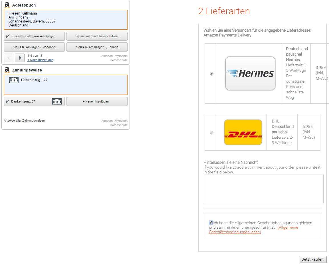 - die Auswahl der Lieferanten ist zwingend, denn je nach gewählter Adresse aus dem Amazon-Adressbuch kann es sein, dass nur bestimmte Lieferanten möglich sind