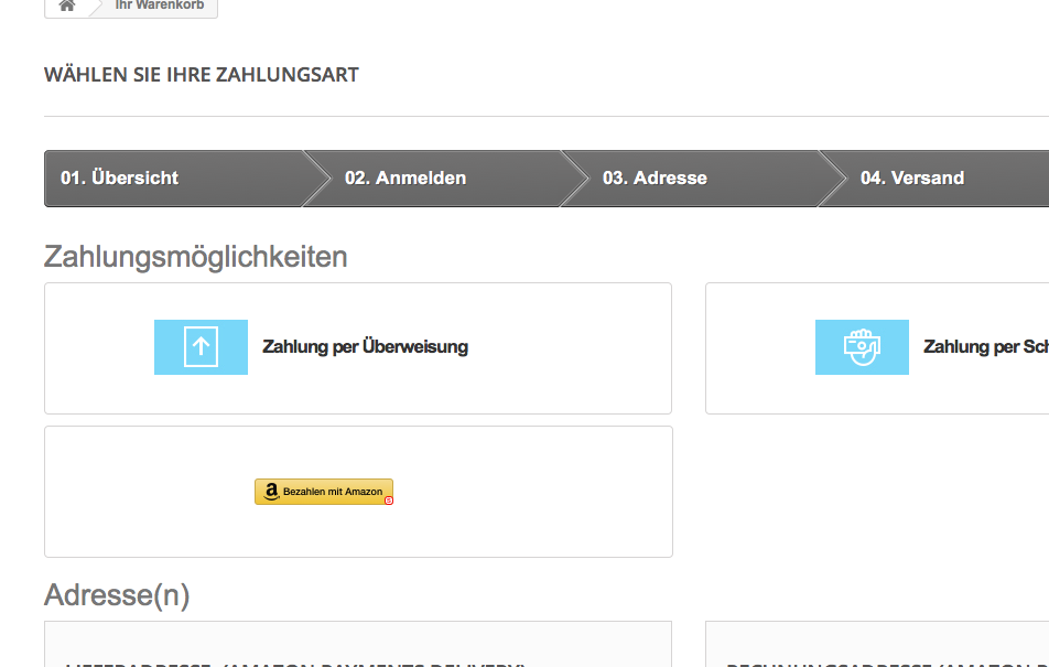 3. Das ganze Modul ist darauf ausgelegt dass man irgendwo im Shop oder im Warenkorb "Rollout" direkt auf "bezahlen mit Amazon" klickt und dann direkt auf der oben beschriebenen Onpage-Checkout Seite landet. Ich finde das nicht so gelungen. Ich persönlich würde den Button gerne von überall verbannen und nur noch im letzten Step des 5 Schritte Vorgangs bei den anderen Zahlmethoden einbinden. Dafür sollte es eine Option geben. Das mache ich mit Paypal genauso. Ich finde es für den Kunden sehr verwirrend wenn es 3 verschiedene Wege nach Rom gibt.