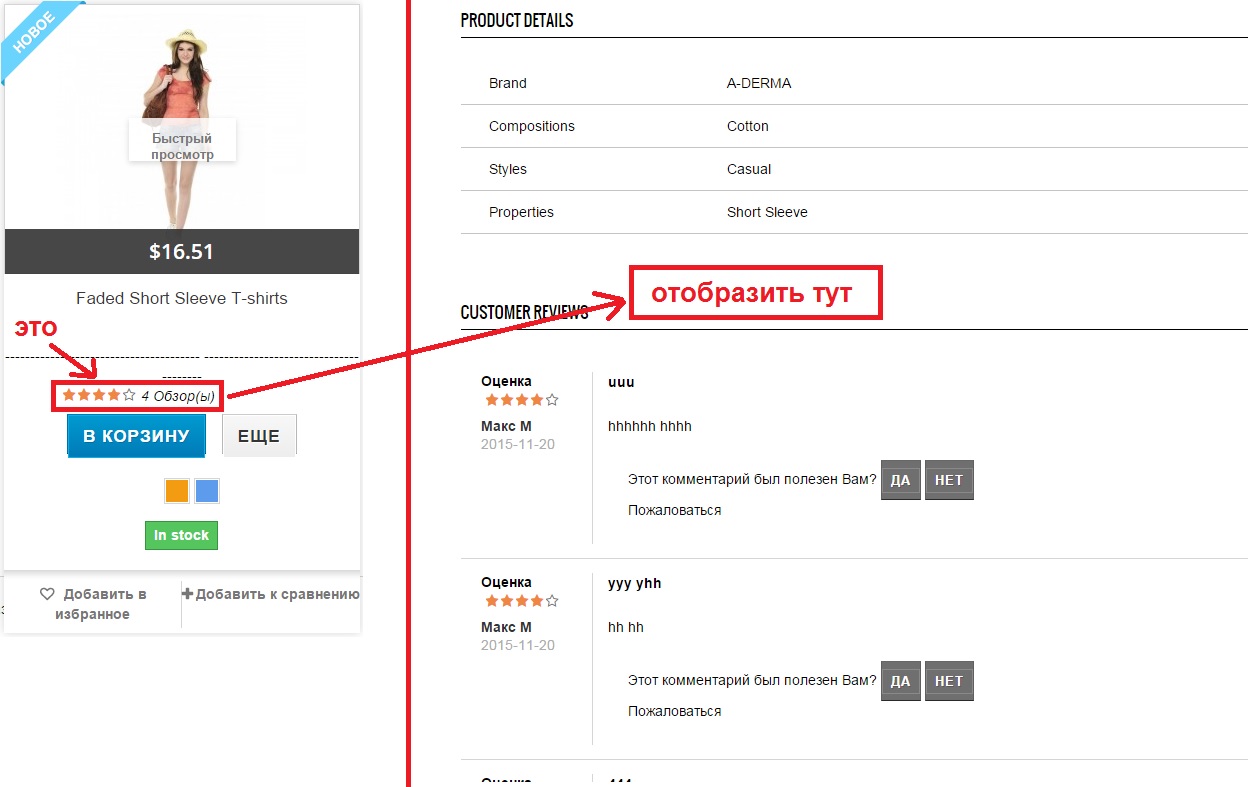 miron8888 Posted November 23, 2015 Share Posted November 23, 2015 Добрый день! Подскажите каким образом вывести общий рейтинг товара в самой карточке товара прям как в списке товаров? Такой же как в списке товаров. Там он выводится так:{capture name='displayProductListReviews'}{hook h='displayProductListReviews' product=$product}{/capture}{if $smarty.capture.displayProductListReviews}{hook h='displayProductListReviews' product=$product}{/if} 1 Link to comment Share on other sites More sharing options...