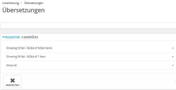 eleazar Posted November 25, 2015 Share Posted November 25, 2015 Ich vermute mal, du nutzt nicht das Standard-Template, denn da ist die Übersetzung vorhanden. Wenn nur dieses Item unübersetzt ist, dann reicht die manuelle Ergänzung hier: Lokalisierung --> Übersetzungen --> Front Office --> <DeinTemplate> --> Abschnitt: Pagination Hier dürften folgende Variablen nicht übersetzt sein: Showing %1$d - %2$d of %3$d items Showing %1$d - %2$d of 1 item Wenn es sich aber um mehr als diese Items handelt, dann solltest du unter Lokalisierung --> Übersetzungen --> Abschnitt: Manueller Import eines Sprachpakets das deutsche Sprachpaket in dein Template importieren. Du kannst die aktuelle de.gzip auf der PrestaShop-Übersetzungsseite erhalten. Achte aber darauf, dass du den Download für die richtige Programmversion machst. 1 Link to comment Share on other sites More sharing options...