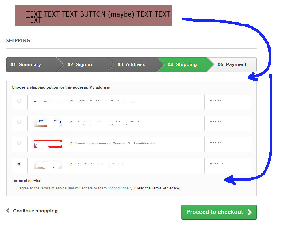 renier8 Posted December 2, 2015 Share Posted December 2, 2015 Hi everyone, As the topic says, I need to add additional info / text / button to my "shipping" selection page. Preferably somewhere as indicated on the attached image. Just clicking on the Terms button is not enough. My customers does not read it, and it causes problems with shipping cost selection. Please see image attached. I am not a coder and use Prestashop in its simplist form. So go easy on me with the tech-stuff, but I am willing to try. Thank you for your time. Link to comment Share on other sites More sharing options...