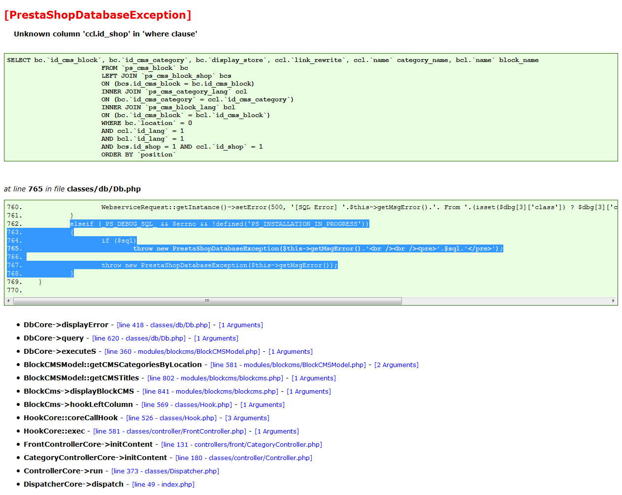 khushbu soni Posted December 11, 2015 Share Posted December 11, 2015 SELECT bc.`id_cms_block`, bc.`id_cms_category`, bc.`display_store`, ccl.`link_rewrite`, ccl.`name` category_name, bcl.`name` block_name FROM `ps_cms_block` bc LEFT JOIN `ps_cms_block_shop` bcs ON (bcs.id_cms_block = bc.id_cms_block) INNER JOIN `ps_cms_category_lang` ccl ON (bc.`id_cms_category` = ccl.`id_cms_category`) INNER JOIN `ps_cms_block_lang` bcl ON (bc.`id_cms_block` = bcl.`id_cms_block`) WHERE bc.`location` = 0 AND ccl.`id_lang` = 1 AND bcl.`id_lang` = 1 AND bcs.id_shop = 1 AND ccl.`id_shop` = 1 ORDER BY `position` Unknown column 'ccl.id_shop' in 'where clause' and also Unknown column id_product in ps_image_shop table. I follow this step: move all files from one server to another server. and also import database in new server. I changed database name, username and password in setting.inc.php. in database, domain and domain_ssl change 'domainname.effective-internet.com' to 'www.domainname' in ps_shop_url table. Admin side not display product list How to solve this problem? Thank you in advance Link to comment Share on other sites More sharing options...