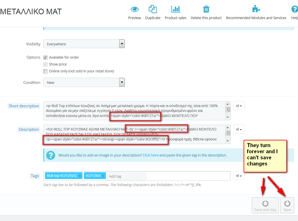 CarlosW Posted December 15, 2015 Share Posted December 15, 2015 (edited) When I go to Catalog>Products and want to edit a product, I see the buttons "Save and Stay" and "Save" turning forever without stopping. As a result I can't save any changes to the product. Moreover I started to see also the formatting code together with the text inside the descriptions (see attached picture). I don't know if this has something to do with my problem, but my hoster moved me 2 days ago to a new server, and I am afraid that he probably did something wrong with the database. I would appreciate any hints to solve the problem. Edited December 21, 2015 by CarlosW (see edit history) Link to comment Share on other sites More sharing options...