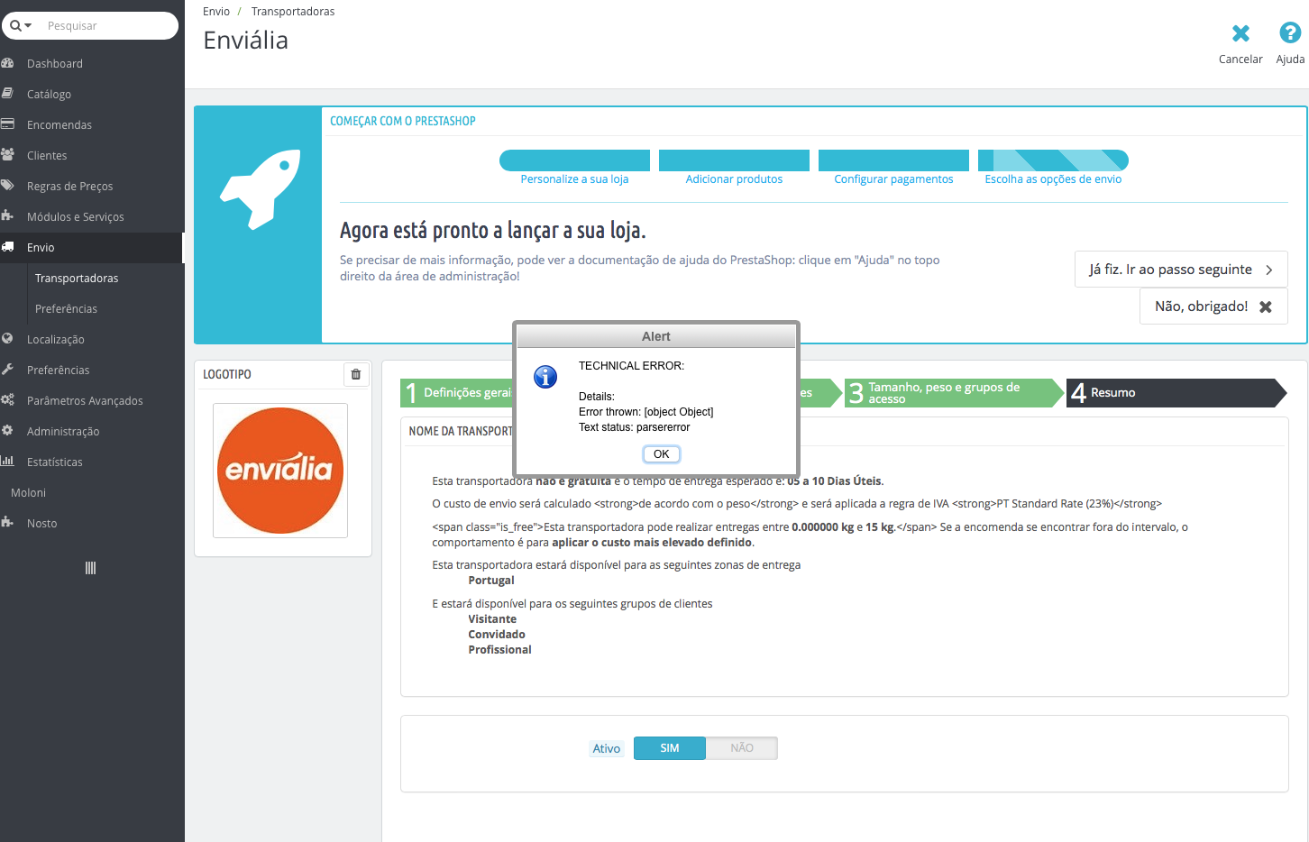 aquapipe Posted December 15, 2015 Share Posted December 15, 2015 Inserir a transportador com o qual vamos trabalhar, mas não consigo finalizar salvar as edições realizadas na transportadora. Pois aparece um pop-up com o seguinte erro: ALERT TECNICAL ERROR: Details: Error thrown: object Object Text Status: parsererror Alguém pode ajudar-me a resolver este erro ou bug? Link to comment Share on other sites More sharing options...