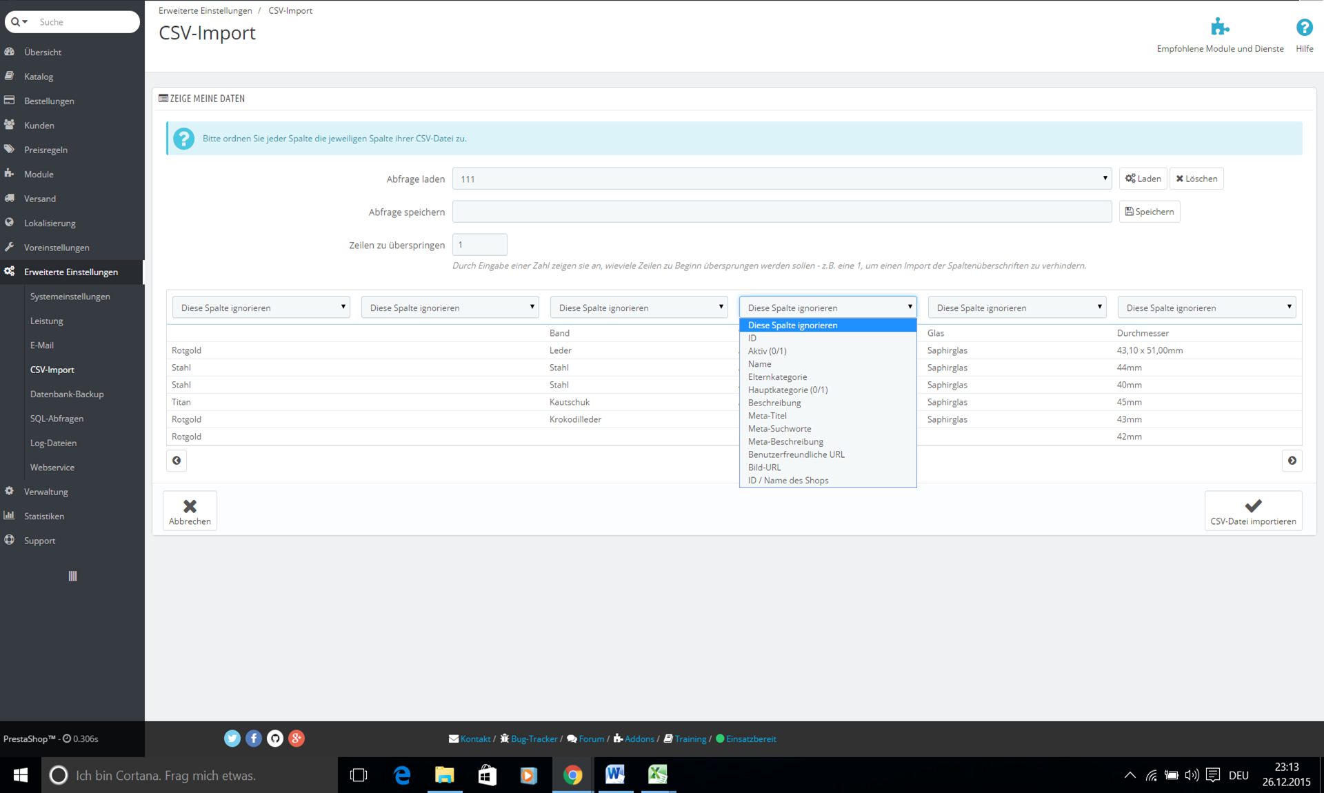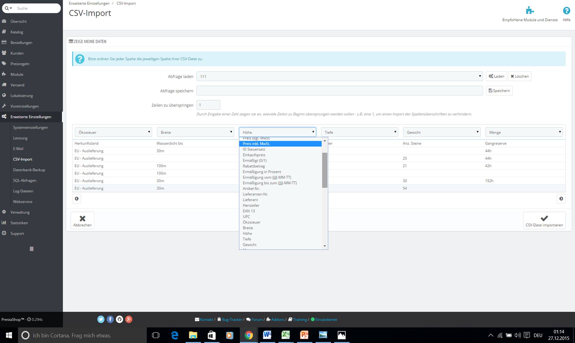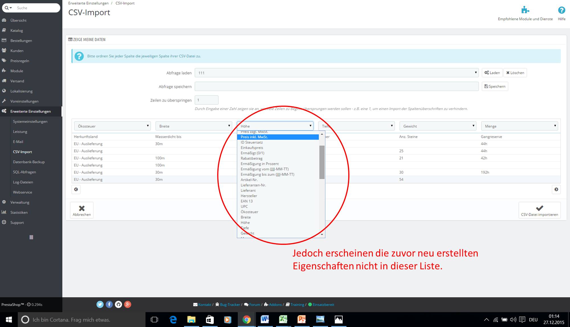premora Posted December 27, 2015 Author Share Posted December 27, 2015 Leider konnte ich mein Problem nicht genau schildern. Nun habe ich noch weitere Detailbilder angehängt. Ich bin folgendermaßen vorgegangen. 1. Unter der Rubrik Eigenschaften von Artikeln, habe ich weitere Eigenschaften hinzugefügt. 2. Habe meine CSV Datei "artikel" hochgeladen. 3. Leider kann ich bei der Zuordnung zu den einzelnen Spalten diese Eigenschaften nicht zuordnen, Da immer noch die bereits zuvor eingestellten Eigenschaften wie Höhe, Tiefe usw erscheinen. Vielen Dank. Link to comment Share on other sites More sharing options...