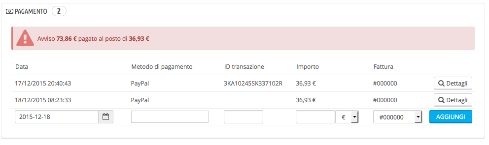 Bottega Agraria Posted March 18, 2016 Author Share Posted March 18, 2016 Ciao a tutti, ho lo stesso problema e vedo che non è stato risolto. Anche a me da un pagamento con il numero di transazione corretta al momento dell'ordine, e uno dopo circa 20 minuti dove viene collegato ad un numero di fattura di PS che è #FA000000. Controllando su paypal la transazione è solo una ed è corretto, ma su PS c'è questo errore e vorrei risolverlo. Ho già disabilitato sia le bolle sia le fatture dal backend ma non cambia nulla. Qualcuno ha idee? Ciao, io ho risolto così: Vai in Ordini/stati e depenna la voce fatture dove non è necessaria... se è abilitata sia su pagamento che su consegna ti verrà contata doppia (e di seguito il pagamento) anche se hai disabilitato le fatture da Fatture/Attiva fatturazione (NO) Ciao Sara Link to comment Share on other sites More sharing options...