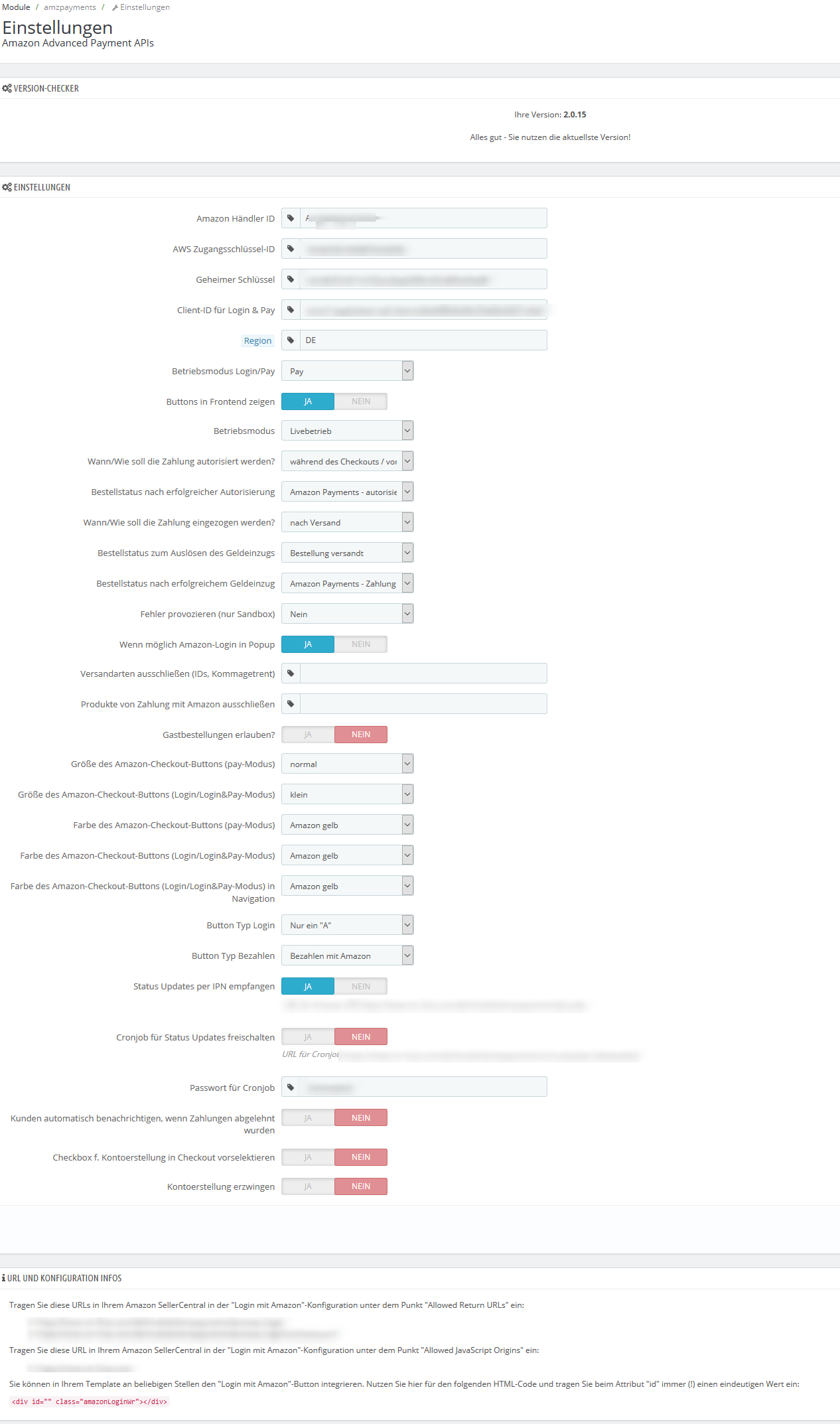 dusticelli Posted December 29, 2015 Share Posted December 29, 2015 (edited) Hallo Rainer, ich poste Dir hier mal die Einstellungen mit denen es bei mir klappt. Du kannst ja mal vergleichen. Jedenfalls, wenn im Quelltext die Zahlart nicht zu sehen ist, dann wird sie ja auch nicht geladen. Evtl. ist es auch abhängig von der von Dir getroffenen Länder-Einschränkung. Das kommt aber wohl darauf an, mit welchem Checkout du fährst. Wenn Du advanced EU Compliance nutzt, und in diesem Modul die "Bestellübersicht aktivieren" auf "on" stehen hast, dann müssten (leider) alle Zahlarten gezeigt werden, denn das ist ein Bug auf den ich gestoßen bin. Das heißt nämlich auf der anderen Seite, dass Du für Kunden aus dem Ausland, mit dieser (für den deutschen Markt im Grunde einzig rechtlich möglichen) Konfiguration keine Zahlart ausblenden kannst. Also hier mal wie es auf jeden Fall klappen sollte Voreinstellungen > Bestellungen Dann Advanced EU Compliance Zuguterletzt Amazon Login & Pay Versuch das mal zu vergleichen mit Deinen Einstellungen. Und wie gesagt, werfe auch mal einen Blick auf Module > Zahlung, dann die Seite weiter nach unten scrollen bis zu den Ländereinschränkungen, und dann mal nachsehen, ob Du bei Deutschland evtl. "keinen" Haken bei Amazon Payment hast. Edited December 29, 2015 by dusticelli (see edit history) Link to comment Share on other sites More sharing options...