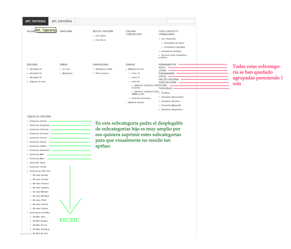 Robili Posted December 28, 2015 Share Posted December 28, 2015 Hola a todos, estoy intentando poner una barra horizontal en el menú de mi web. De hecho ya lo he conseguido ahora bien, después de meter las categorías en el desplegable de dicha categoría me salen las subcategorias y subcategorias hijo lo que hace que todo quede descolocado y amontonado. Yo con la intención de acortar el desplegable he pensado en quitar visualmente del menú de la barra horizontal las subcategorias hijo, de esta manera entiendo que se podrán colocar las subcategorias padre. ¿alguien sabe si es posible eso? o de que otra manera puedo ordenarlo para que no se amontone??. No se si me he explicado bien, de todas formas dejo una imagen y el enlace de la web. Ahh la versión es la 1.6.1.3. De antemano gracias a todos por la ayuda. http://www.curtidosytapicerias.com/prestashop16/ Link to comment Share on other sites More sharing options...