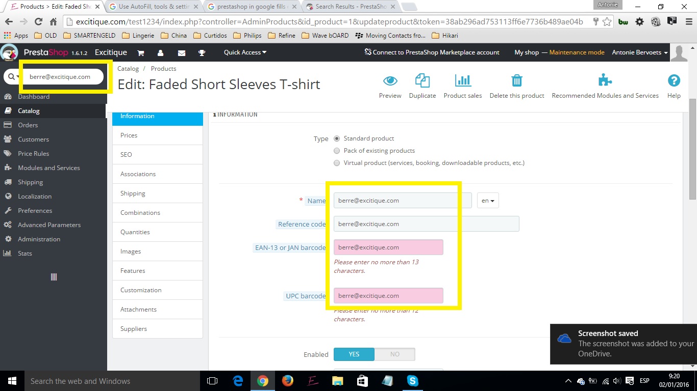 berre Posted January 2, 2016 Share Posted January 2, 2016 Running prestashop 1.6.1.2, all fields in back office are filled with my email address. It doesn't matter if in products, categories, or any search field, all are filled with my email address. This only happens in Google Chrome, and only on this computer as I have logged on on another computer and it didn't fill any fields. I have disabled autofill in Google Chrome Settings and still no succes. I have included a screen shot of the problems with all email addresses highlighted with a yellow rectangle. This is very annoying as when not aware of deleting every (not desired) entry before saving, it will be implemented in my website. What could possibly cause this, and more important how to disable this. Link to comment Share on other sites More sharing options...