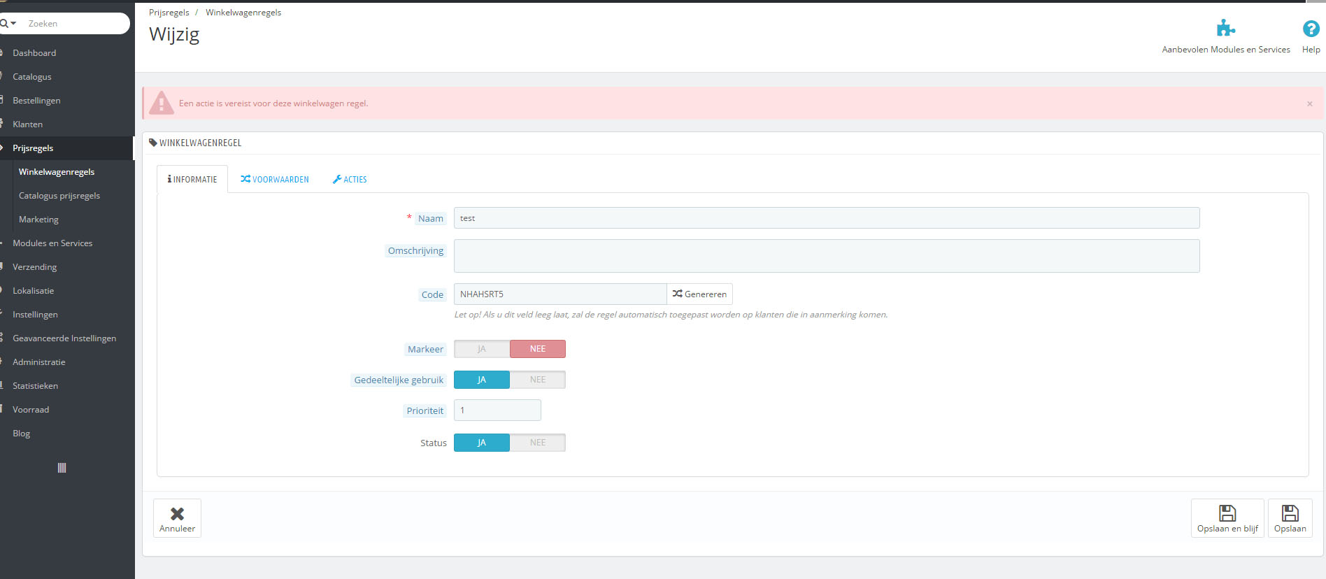 Simonas Invertus Posted January 4, 2016 Share Posted January 4, 2016 Click 'Acties' and choose what you want to do: Percent discount Amount discount Free gift And then click save. You should see no error. Link to comment Share on other sites More sharing options...