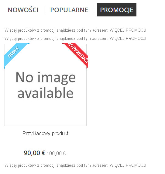 rusiano Posted January 4, 2016 Share Posted January 4, 2016 Witam, czy jest jakiś sposób na dodanie dodatkowej treści do zakładki promocje na stronie głównej? Chciałbym aby pod produktami był krótki tekst. W tym celu edytowałem plik product-list.tpl i po linijce 217 czyli po zamknięciu znacznika </ul> dodałem swoją treść. Niestety pojawia się ona również na zakładkach NOWOŚCI i POPULARNE i w dodatku treść wyświetla się kilka razy. Wygląda to tak: Wersja Prestashop: 1.6.1.3 Szablon: domyślny default-bootstrap Link to comment Share on other sites More sharing options...