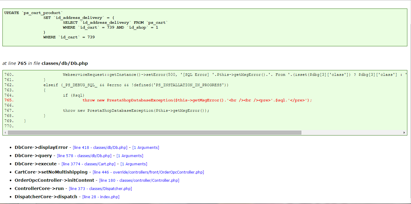 javiersaord Posted January 4, 2016 Share Posted January 4, 2016 Hi, I have a flash module that calculates the measurements of the product, once calculated to give the button to add to cart see this error: [PrestaShopDatabaseException]Duplicate entry '739-6261-21011-0' for key 'PRIMARY' UPDATE `ps_cart_product` SET `id_address_delivery` = ( SELECT `id_address_delivery` FROM `ps_cart` WHERE `id_cart` = 739 AND `id_shop` = 1 ) WHERE `id_cart` = 739 at line 765 in file classes/db/Db.php 760. WebserviceRequest::getInstance()->setError(500, '[SQL Error] '.$this->getMsgError().'. From '.(isset($dbg[3]['class']) ? $dbg[3]['class'] : '').'->'.$dbg[3]['function'].'() Query was : '.$sql, 97); 761. } 762. elseif (_PS_DEBUG_SQL_ && $errno && !defined('PS_INSTALLATION_IN_PROGRESS')) 763. { 764. if ($sql) 765. throw new PrestaShopDatabaseException($this->getMsgError().'<br /><br /><pre>'.$sql.'</pre>'); 766. 767. throw new PrestaShopDatabaseException($this->getMsgError()); 768. } 769. } 770. DbCore->displayError - [line 418 - classes/db/Db.php] - [1 Arguments] 413. if ($this->connect()) 414. $this->result = $this->_query($sql); 415. } 416. 417. if (_PS_DEBUG_SQL_) 418. $this->displayError($sql); 419. 420. return $this->result; 421. } 422. 423. /** DbCore->query - [line 578 - classes/db/Db.php] - [1 Arguments] 573. public function execute($sql, $use_cache = true) 574. { 575. if ($sql instanceof DbQuery) 576. $sql = $sql->build(); 577. 578. $this->result = $this->query($sql); 579. if ($use_cache && $this->is_cache_enabled) 580. Cache::getInstance()->deleteQuery($sql); 581. 582. return (bool)$this->result; 583. } DbCore->execute - [line 3774 - classes/Cart.php] - [1 Arguments] 3769. '.(Configuration::get('PS_ALLOW_MULTISHIPPING') ? ' AND `id_shop` = '.(int)$this->id_shop : ''); 3770. 3771. $cache_id = 'Cart::setNoMultishipping'.(int)$this->id.'-'.(int)$this->id_shop.((isset($this->id_address_delivery) && $this->id_address_delivery) ? '-'.(int)$this->id_address_delivery : ''); 3772. if (!Cache::isStored($cache_id)) 3773. { 3774. if ($result = (bool)Db::getInstance()->execute($sql)) 3775. $emptyCache = true; 3776. Cache::store($cache_id, $result); 3777. } 3778. 3779. if (Customization::isFeatureActive()) CartCore->setNoMultishipping - [line 446 - override/controllers/front/OrderOpcController.php] 441. } 442. } 443. } 444. 445. // As the cart is no multishipping, set each delivery address lines with the main delivery address 446. $this->context->cart->setNoMultishipping(); 447. 448. $is_old_browser = false; 449. preg_match('/MSIE (.*?);/', $_SERVER['HTTP_USER_AGENT'], $matches); 450. if (count($matches) < 2) { 451. preg_match('/Trident\/\d{1,2}.\d{1,2}; rv:([0-9]*)/', $_SERVER['HTTP_USER_AGENT'], $matches); OrderOpcController->initContent - [line 180 - classes/controller/Controller.php] 175. 176. if (!$this->content_only && ($this->display_header || (isset($this->className) && $this->className))) 177. $this->initHeader(); 178. 179. if ($this->viewAccess()) 180. $this->initContent(); 181. else 182. $this->errors[] = Tools::displayError('Access denied.'); 183. 184. if (!$this->content_only && ($this->display_footer || (isset($this->className) && $this->className))) 185. $this->initFooter(); ControllerCore->run - [line 373 - classes/Dispatcher.php] 368. // Execute hook dispatcher 369. if (isset($params_hook_action_dispatcher)) 370. Hook::exec('actionDispatcher', $params_hook_action_dispatcher); 371. 372. // Running controller 373. $controller->run(); 374. } 375. catch (PrestaShopException $e) 376. { 377. $e->displayMessage(); 378. } DispatcherCore->dispatch - [line 28 - index.php] 23. * @license http://opensource.org/licenses/osl-3.0.php Open Software License (OSL 3.0) 24. * International Registered Trademark & Property of PrestaShop SA 25. */ 26. 27. require(dirname(__FILE__).'/config/config.inc.php'); 28. Dispatcher::getInstance()->dispatch(); with payment in five steps prestashop if it works but with the One Page Checkout module does not work and this error appears. I need help, please. Thanks. This is the image capture of the error Link to comment Share on other sites More sharing options...