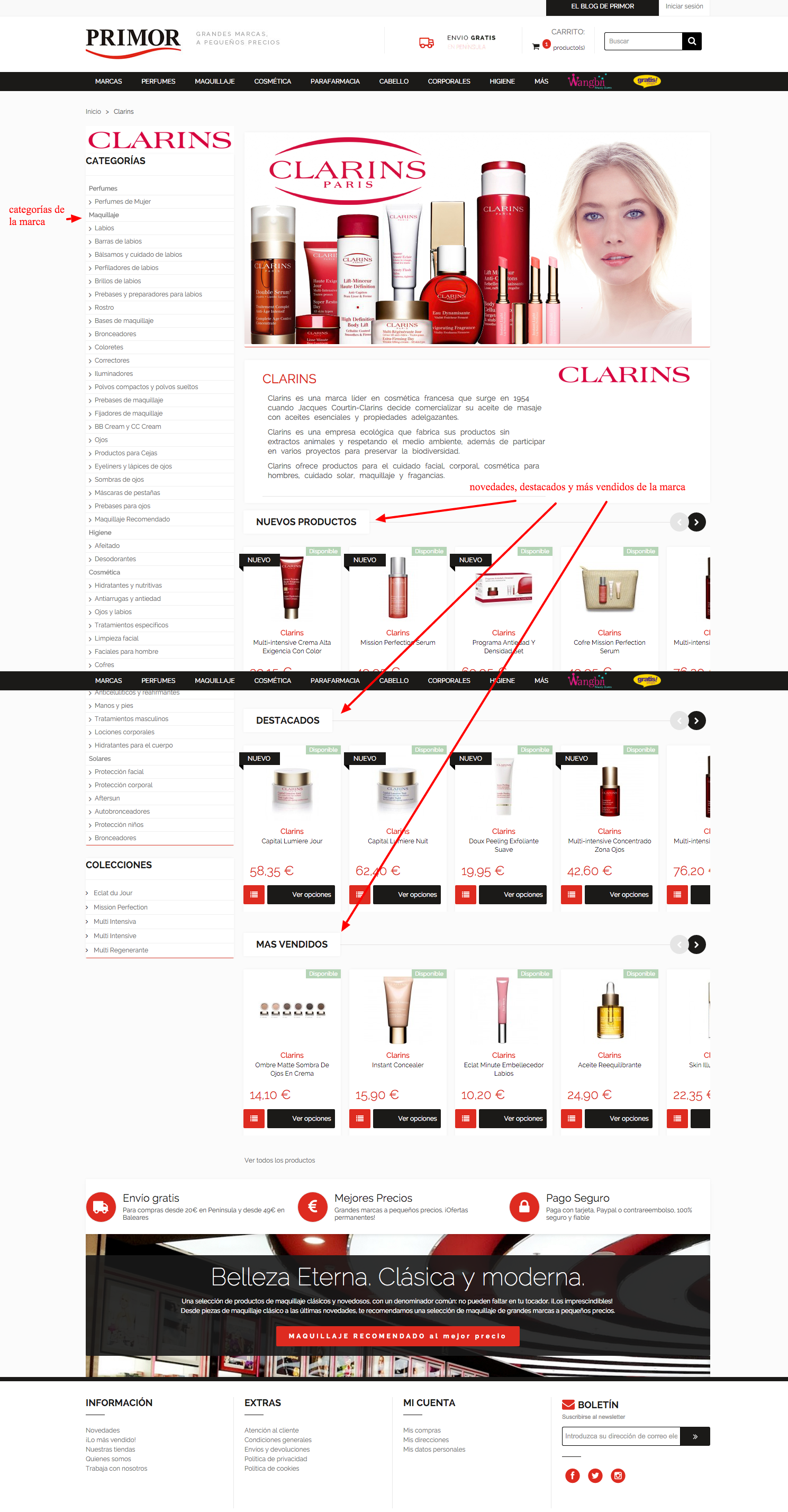 fdelolmo Posted January 7, 2016 Share Posted January 7, 2016 Hola, Necesito hacer algo como lo que tiene http://www.primor.eu/133_clarins con las marcas, es decir, cuando entremos en la marca debe haber los módulos de NOVEDADES, DESTACADOS y LOS MÁS VENDIDOS (al igual que a veces se pone en las portadas de la tiendas), pero sólo con los productos de la marca que estamos visitando. También como podríamos hacer para que el bloque lateral de categoría sean sólo el de la marca, como por ejemplo: http://www.primor.eu/133_clarins/6-labios Os adjunto una captura de las cosas a las que me refiero. ¿Se os ocurre algún módulo? Gracias de antemano. Link to comment Share on other sites More sharing options...