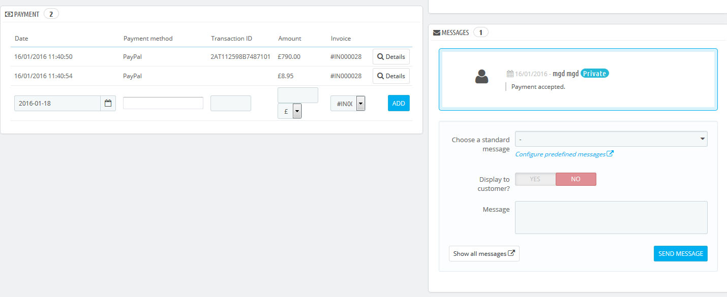 babyewok Posted January 19, 2016 Author Share Posted January 19, 2016 The situation with this has changed slightly. The module developer resurfaced and as he has fixed one issue, at each turn another seems to arise! The current situation is that in certain instances, PayPal seems to have the correct shipping price on the PayPal payment page, but then when sent back to the site, the total is incorrect on the payment success page. The back office shows the correct total, but shows the PayPal payment as beiing split into two payments, In sandbox mode, the notification to the buyer shows the incorrect total.To explain, the shipping module adds a set shipping price per item for some products e.g £15 per dress purchased. We also use the PS carrier weight bands to deal with other products, so we might have one dress (shipping £15 as set by the module) and one other item with shipping £8.95 (as set by PS carrier weight bands). The total shipping should be £23.95 (£15 + £8.95).If an order consists of only items whose shipping is dealt with by the module, then everything is fine. If it consists of only items whose shipping is dealt with by PS, everything is fine. The problem arrises when the two shipping calculations are combined. When returning from PayPal, the payment success page shows the order total minus the £8.95 shipping. The order page in BO shows the full correct total, but the payment is shown as split (see attached screenshot). Interestingly the second payment amount is £8.95 - the shipping amount set by PS. This amount is also not included on the sandbox notification which shows the shipping total as just £15. The shipping module developer seems to think this is unique to my installation as when tested on their own installation they don't get an issue.I am getting frustrated with the very slow responses from the developer and am not confident that this will be resolved.I seek a developer who can find the cause of this issue and resolve it. Link to comment Share on other sites More sharing options...