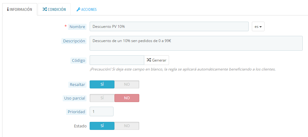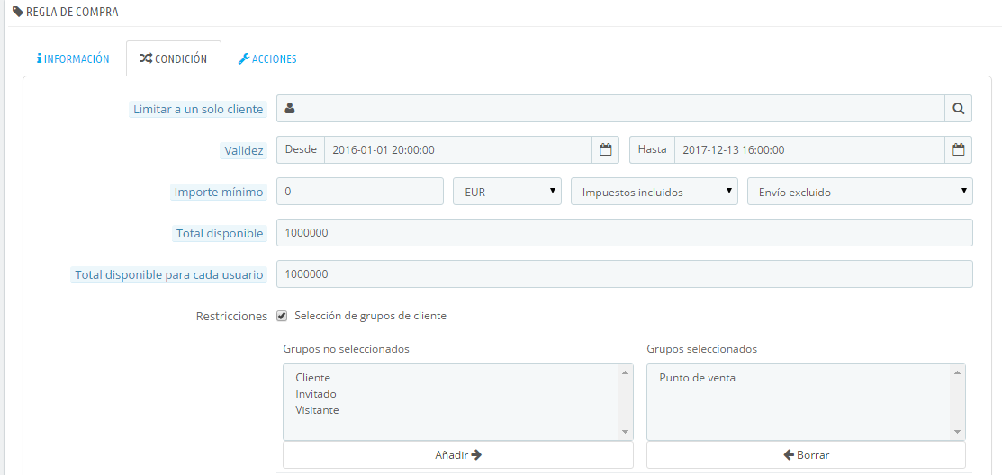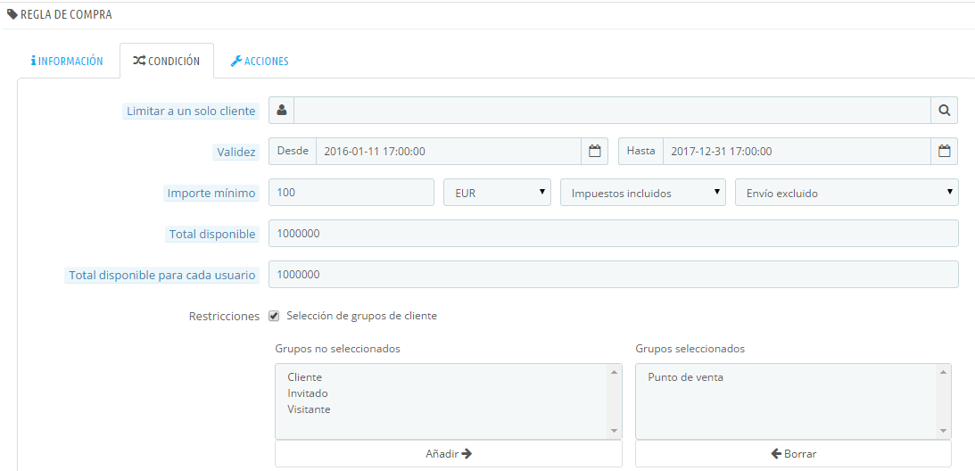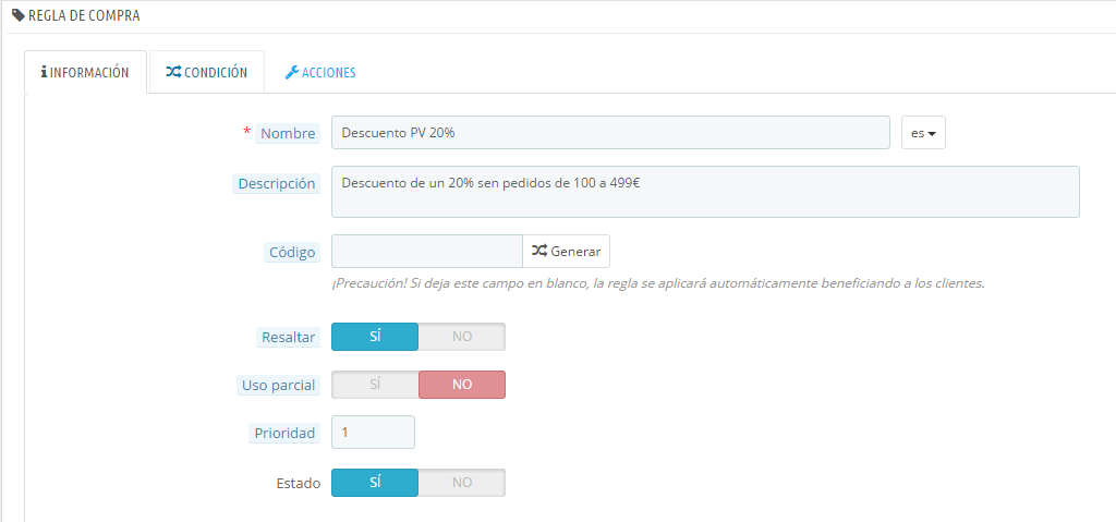 Alberturma Posted January 15, 2016 Author Share Posted January 15, 2016 Creo que el problema lo tienes en las prioridades. Ponlas así: - de 0 a 99€ --> 10% descuento --> Prioridad 3 - de 100 a 199€ --> 20% descuento --> Prioridad 2 - de 200 a 500€ --> 25% descuento --> Prioridad 1 Y a ver qué tal. ¡Creo que por lo que he probado ahora va bien! ¡Muchísimas Gracias! No entiendo muy bien el tema de las prioridades y por eso las había dejado todas a 1, pensando en que me iba a cambiar. Muchas Gracias, me has ayudado mucho! Link to comment Share on other sites More sharing options...