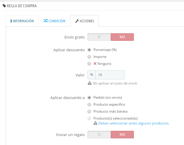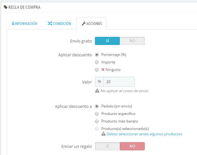 Alberturma Posted January 15, 2016 Author Share Posted January 15, 2016 (edited) Puedes colgar una captura de pantalla de la configuración de algunos de los descuentos? Te adjunto la captura de la relación de 2 descuentos configurados a ver si ves algo que yo no logro ver. Este es la configuración del 10% de descuento: Este es la configuración del 20% de descuento: Muchas Gracias por tu ayuda! Edited January 15, 2016 by Alberturma (see edit history) Link to comment Share on other sites More sharing options...