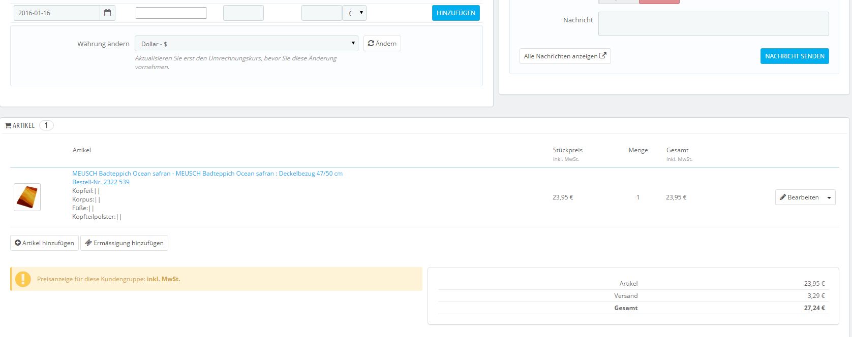 Sobald ich 2 Versandarten habe (Packetversand für ein Handtuch und Speditionsversand für ein Bett) werden mir 2 Rechnungen generiert. Ist es möglich, da nur eine Rechnung generieren zu lassen?