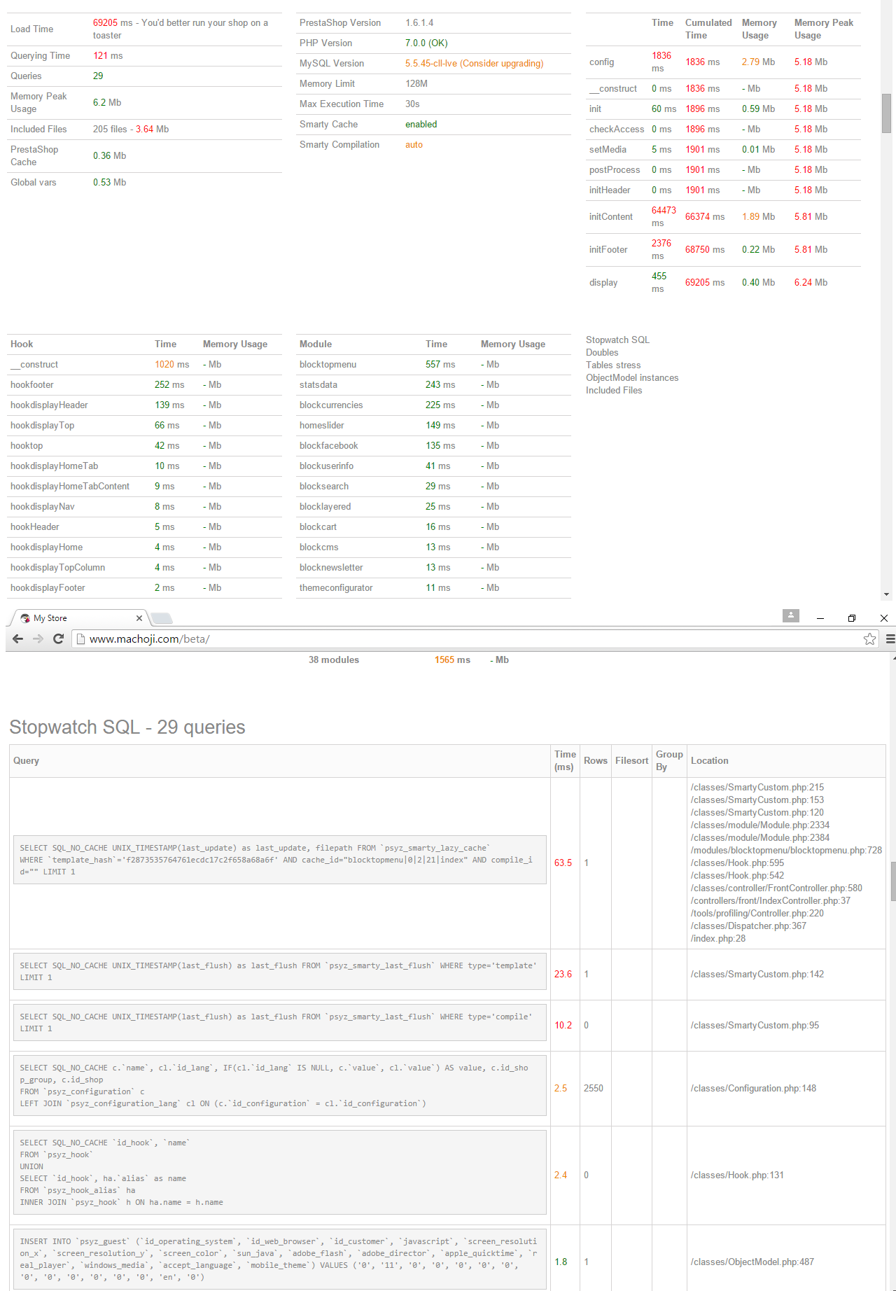 I am new in Prestashop, I've bought shared hosting with Unlimited Plan recently and just installed it. It is taking huge amount of time on page load. Can you please advise me how to resolve it? link: www.machoji.com/beta I've enabled debug mode so you can check it. I've also run queries on SQL-PhpMyAdmin it is just taking 0.0012sec but on web it is taking 63.5ms