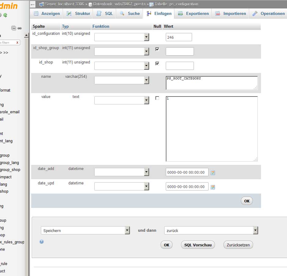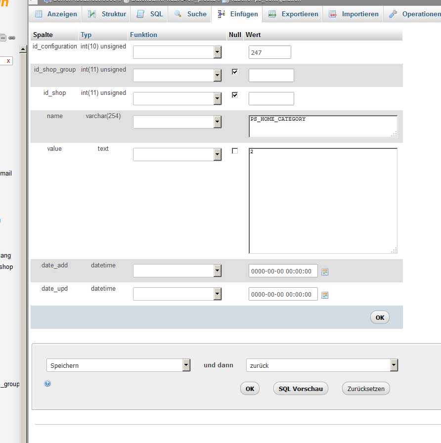 Whiley Posted January 20, 2016 Share Posted January 20, 2016 (edited) Hallo Thomas, mach erst mal eine Sicherung deiner Datenbank. Danach fügst du die beiden Felder in die ps_configuration ein. Das kannst du auch ohne sql-Kenntnisse; im phpmyadmin die ps_configuration aufmachen und ganz oben auf einfügen gehen. Die Felder sollten so aussehen: danach Caches löschen. Grüsse Whiley Edited January 20, 2016 by Whiley (see edit history) Link to comment Share on other sites More sharing options...