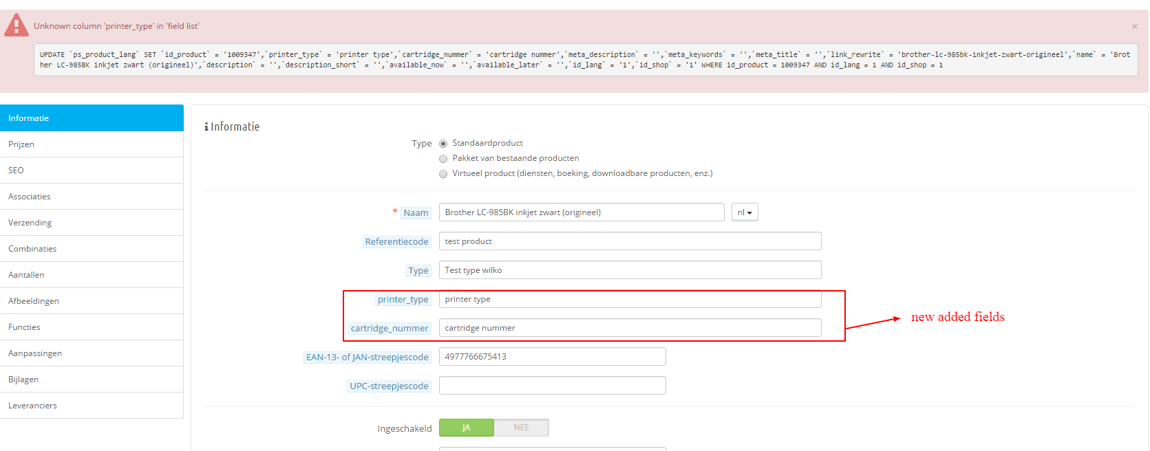 Hartung Posted January 19, 2016 Share Posted January 19, 2016 (edited) Hi, I try to add two new fields to my Prestashop 1.6.0.14 http://www.thecartridgecompany.eu to use for product import. The fields that I added are printer_type cartridge_nummer When I fill those fields manually I get Unknown column 'printer_type' in 'field list' see attachment new added fields What did do wrong? 1) I added the fields in my database, see attachment (added fields to Database) 2) in the informations.tpl i add this lines {* start added by WBF *} <div class="form-group"> <label class="control-label col-lg-3" for="printer_type"> <span class="label-tooltip" data-toggle="tooltip" title="{l s='printer_type'} {l s='Allowed special characters:'} .-_#\"> {$bullet_common_field} {l s='printer_type'} </span> </label> <div class="col-lg-5"> <input type="text" id="printer_type" name="printer_type" value="{$product->printer_type|htmlentitiesUTF8}" /> </div> </div> <div class="form-group"> <label class="control-label col-lg-3" for="cartridge_nummer"> <span class="label-tooltip" data-toggle="tooltip" title="{l s='cartridge_nummer'} {l s='Allowed special characters:'} .-_#\"> {$bullet_common_field} {l s='cartridge_nummer'} </span> </label> <div class="col-lg-5"> <input type="text" id="cartridge_nummer" name="cartridge_nummer" value="{$product->cartridge_nummer|htmlentitiesUTF8}" /> </div> </div> {* end added by WBF *} 3) In my product.php I added /** @var string printer type */ public $printer_type; /** @var string cartridge nummer */ public $cartridge_nummer; and /* fields added by WBF */ /* 'printer_type' => array('type' => self::TYPE_HTML, 'lang' => true, 'validate' => 'isCleanHtml'),*/ /* 'cartridge_nummer' => array('type' => self::TYPE_HTML, 'lang' => true, 'validate' => 'isCleanHtml'),*/ 'printer_type' => array('type' => self::TYPE_STRING, 'validate' => 'isCleanHtml'), 'cartridge_nummer' => array('type' => self::TYPE_STRING, 'validate' => 'isCleanHtml'), Now I can see the added fields I my B.O but cannot use because i'm missing something.. What do I do wrong? Edited January 19, 2016 by Willbefine (see edit history) Link to comment Share on other sites More sharing options...