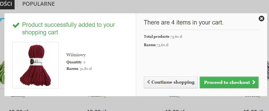 urbanson Posted January 21, 2016 Share Posted January 21, 2016 Witam, gdzie i jak można przetłumaczyć modalne okno, które pojawia się po dodaniu do koszyka? np. nigdzie w tłumaczeniach nie mogę znaleźć frazy "Product successfully added to your shopping cart" z góry dzięki i pozdrawiam Tomasz Link to comment Share on other sites More sharing options...