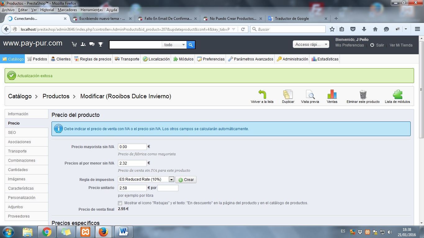 jezabel Posted January 21, 2016 Share Posted January 21, 2016 Buenas tardes Estoy creando mi web, y aunque tengo casi todo creado, de la noche a la mañana. Al modificar el precio de un producto ya creado, precio con iva, me realiza el desglose del iva, pero el precio final y el que después aparece en la web, no es el que yo e indicado, y por mucho que lo modifique de nuevo, no varía. Y ahora mismo al crear un producto nuevo, me acepta toda la información, pero el precio ni tan siquiera lo guarda. Queda en blanco. En ninguna de estas gestiones el sistema, no me indica ningún error o problema. (Aun tengo prestashop en local) Espero que podais orientarme, y sobre todo. Gracias por vuestro tiempo y conocimientos. Link to comment Share on other sites More sharing options...