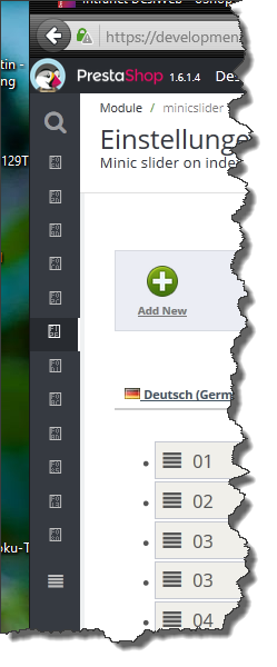 DesiWeb Posted August 17, 2016 Author Share Posted August 17, 2016 Das kannst du noch so oft anschubsen! Niemand kann Gedanken lesen. Da deine Frage so unspezifisch gestellt wurde, wirst du auch keine Antwort bekommen. Au deinen Ausführungen ist ja nicht mal ein Hinweis ersichtlich, was z.B. das Modul macht, wo genau es sich einklinkt, ob du den PrestaShop-Adminbereich oder die Konfiguration des Moduls meinst. für welche PS-Version es geschrieben wurde, welche Version du aktuell einsetzt - um nur das Wichtigste zu nennen. ups - sorry, ich habe erst jetzt gesehen, dass es dazu eine Antwort gab (irgendwie wurde ich gar nicht notifiziert)... Egal. Gerne gebe ich natürlich zuätzliche Angaben - mir war nicht bewusst, dass es zuwenige Infos waren. Das Modul nennt sich: Minic slider on index page v4.1.11 - von minic studio (https://github.com/minicstudio/minicslider) die Icons fehlen im Konfigurationsberich des Moduls meine PS-Version ist die 1.6.1.6 Gerne liefere ich natürlich noch weitere Informationen, sofern dies benötigt wird ... herzliche Grüsse Martin Link to comment Share on other sites More sharing options...