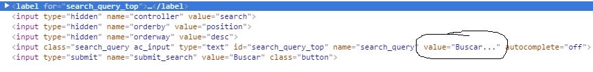 ventura Posted January 26, 2016 Share Posted January 26, 2016 Algo asi te deberia funcionar <input class="search_query form-control" type="text" id="search_query_top" name="search_query" placeholder="{l s='Search' mod='blocksearch'}" value="{$search_query|escape:'htmlall':'UTF-8'|stripslashes}" /> Link to comment Share on other sites More sharing options...