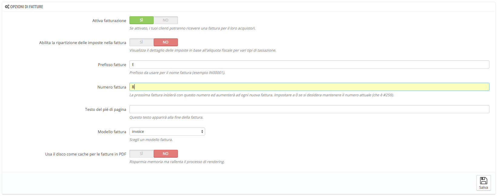 davide73 Posted January 25, 2016 Author Share Posted January 25, 2016 Ciao e grazie per la risposta, in realtà io nelle impostazioni di fatturazione vedo la seguente dicitura (allego anche uno Screenshot): Numero fattura La prossima fattura inizierà con questo numero ed aumenterà ad ogni nuova fattura. Impostare a 0 se si desidera mantenere il numero attuale (che è #259). tale impostazione mi lascia intuire che posso decidere quale numero attribuire alla prossima fattura e che poi il numero verrà incrementato in automatico. Sbaglio o è così? tuttavia pur impostando la numerazione che voglio il sistema continua dalla 259 .. ho già usato questa funzione in realtà non appena ho installato il gesitonale PS ... forse questa impostazione può essere usata una volta soltanto? in tutti i casi lascierà l'imput da qualche parte nel DB, ecco vorrei tanto sapere dove per poter intervenire direttamente la. Spero che possiate aiutarmi. NOTA: un aggiornamento, che a me mette sempre timore, risolverebbe il problema? Link to comment Share on other sites More sharing options...