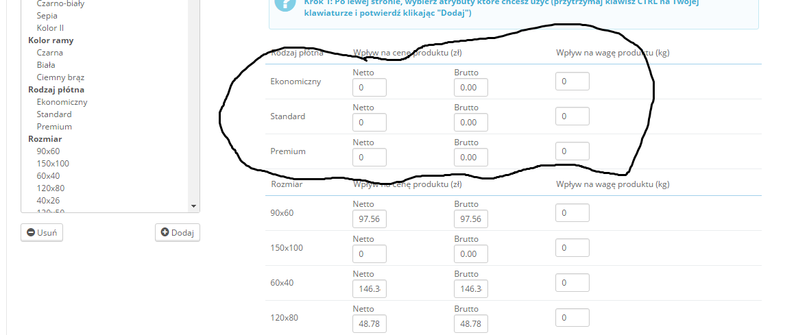 I pytanie czy da się to jakość uprościć czy pozostaje mi tylko ręczne zmienianie cen dla poszczególnego rodzaju płótna?