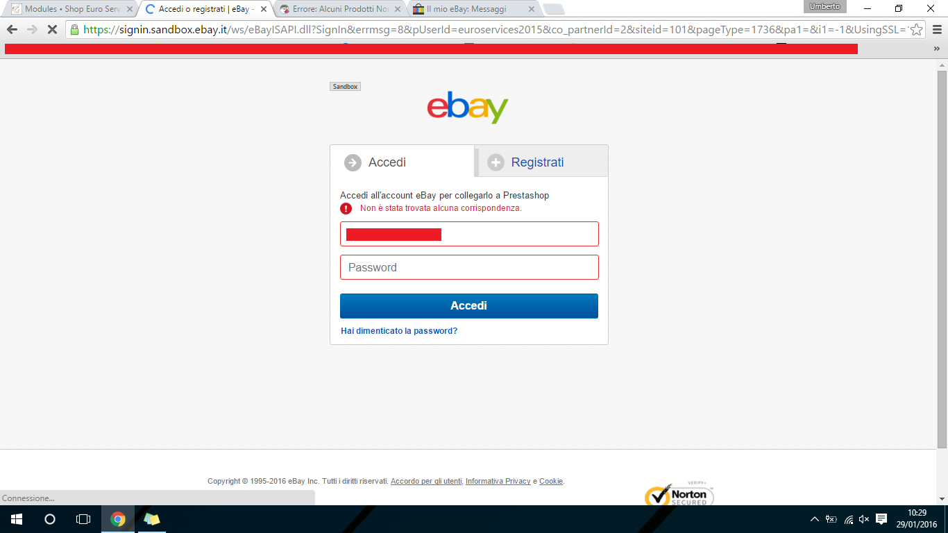 Ho settato nuovamente il mio account e quando accedo con i dati di ebay mi fa accedere tramite "Sandbox" e mi da errore nella password.. Ho provato ad effettuare anche la registrazione su quest'ultimo e mi dice errore della pagina