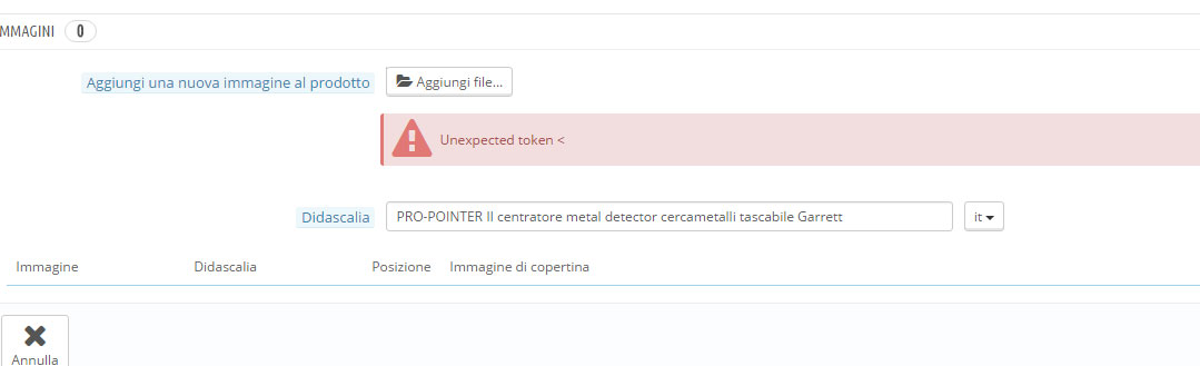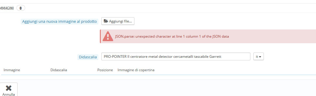 duemilioni Posted January 28, 2016 Share Posted January 28, 2016 (edited) Ciao, in modo del tutto inaspettato il mio sito in BO non mi permette più di caricare immagini nei prodotti, se provo con firefox mi da come errore: JSON.parse: unexpected character at line 1 column 1 of the JSON data se provo con Chrome Unexpected token < alleo screenshot Versione PS. 1.6.0.9 Ho cercato in giro ma non ho trovato soluzioni... qualcuno ha qualche idea ? Grazie Edited January 31, 2016 by duemilioni (see edit history) Link to comment Share on other sites More sharing options...