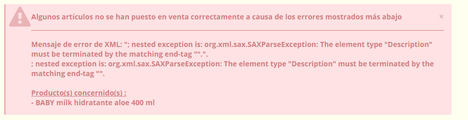 babeskor Posted January 29, 2016 Share Posted January 29, 2016 Tras descargar y configurar el modulo de ebay y la plantilla a la hora de importar los productos me da siempre un error vinculado con la plantilla. Mensaje de error de XML: "; nested exception is: org.xml.sax.SAXParseException: The element type "Description" must be terminated by the matching end-tag "".".; nested exception is: org.xml.sax.SAXParseException: The element type "Description" must be terminated by the matching end-tag "". No se como solucionarlos he probado mil maneras. Yo utilizo una plantilla creada por widgetchimp y que ya he utilizado anteriormente en muchas descripciones. Link to comment Share on other sites More sharing options...