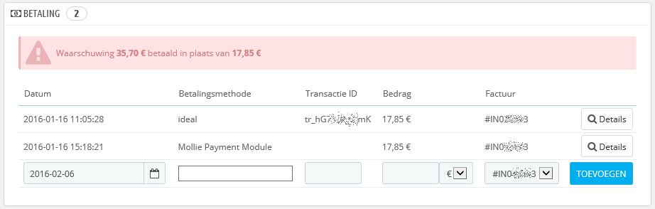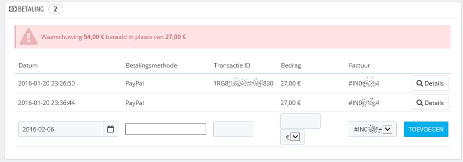 MaakMijnWitgoed Posted February 6, 2016 Share Posted February 6, 2016 Ik zie bij veel bestellingen staan dat 2x het bedrag is betaald. Bijvoorbeeld: 2016-02-06 10:43:20 PayPal 520414900XXXX225N 9,35 € Kaartnummer Niet bepaald Kaart merk Niet bepaald Vervaldatum kaar Niet bepaald Kaart houder Niet bepaald 2016-02-06 13:15:16 PayPal 9,35 € #IN000000 Ik dacht eerst dat het aan mijn iDEAL implementatie (Mollie) lag (zie het plaatje "iDEAL betaling"), maar dat blijkt niet zo te zijn, want de PayPal betalingsmodule van PrestaShop zelf doet hetzelfde (zie hierboven en het andere plaatje ;-) Iemand een idee of dit zelf te fixen is, of dat PrestaShop dit binnenkort gefixt heeft, of negeren jullie dit gewoon? Link to comment Share on other sites More sharing options...