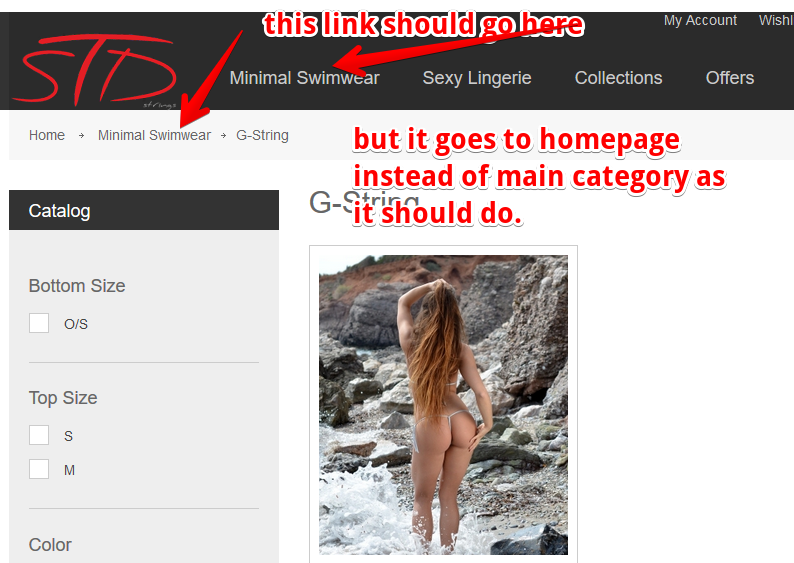 [email protected] Posted February 7, 2016 Share Posted February 7, 2016 Hello, I need a help on a breadcrumb category links. Recently finished this eshop : www.stdstrings.com My problem is that when you go to a subcategory like here : https://stdstrings.com/en/255-en-g-string-255 On the breadcrumb you see Home - Minimal Swimmwear- G-string. So clicking on Minimal Swimmwear should go to the category insted of this the home url is there. How can I fix that? I attached and an image. Thank you for any help. Link to comment Share on other sites More sharing options...